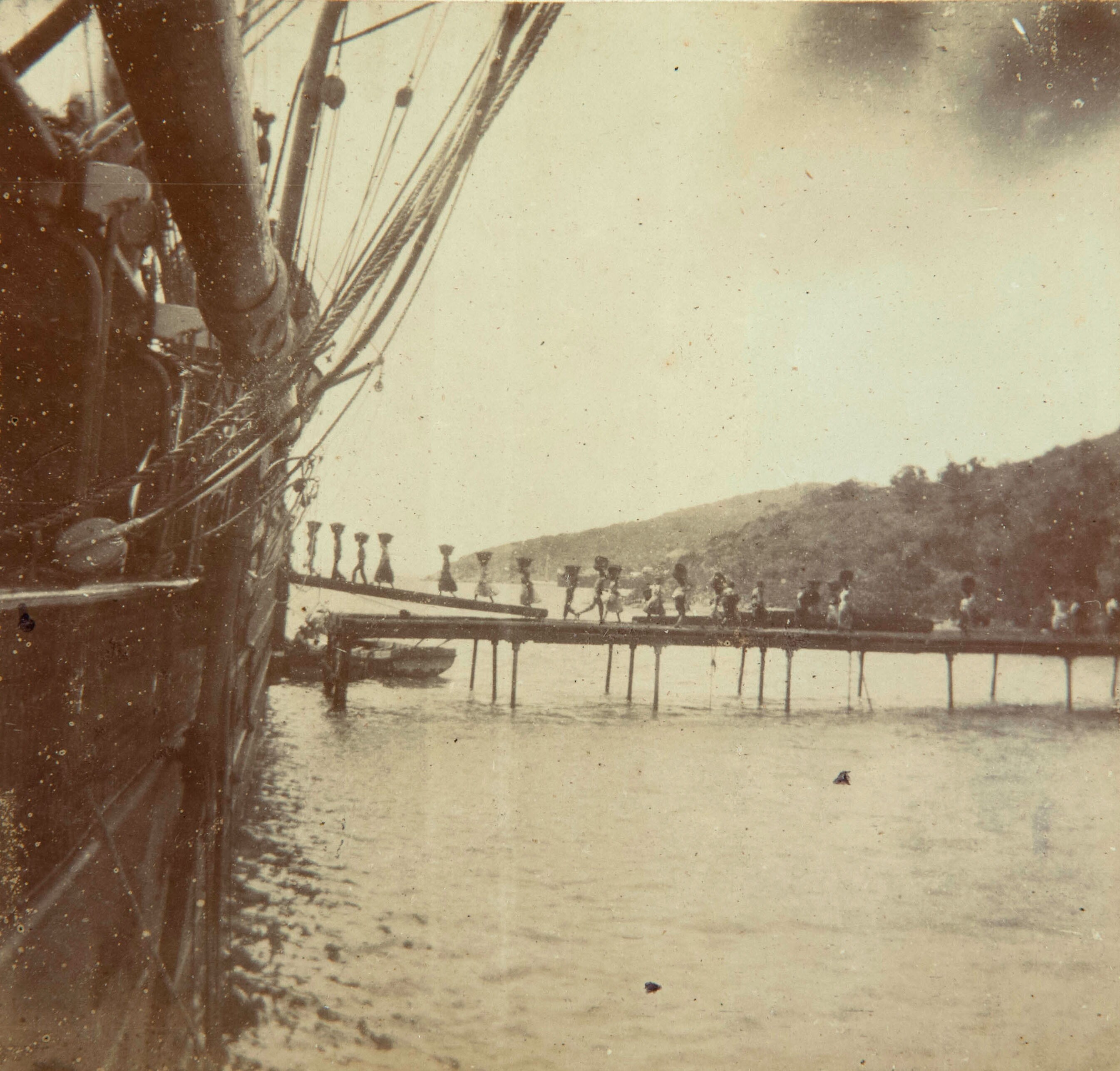 Met manden op het hoofd worden kolen aan boord gelad...