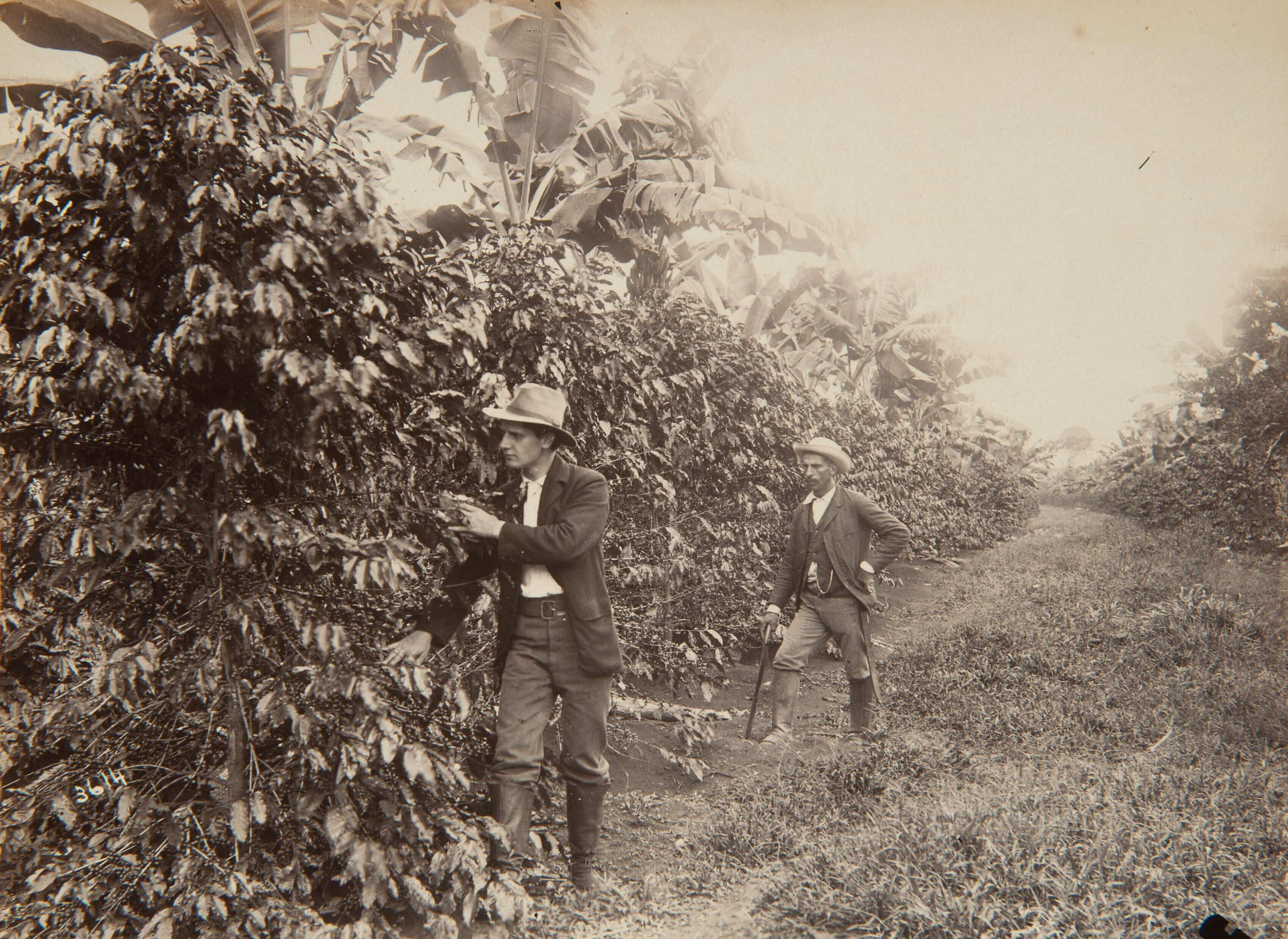 Twee mannen poseren in een koffieplantage