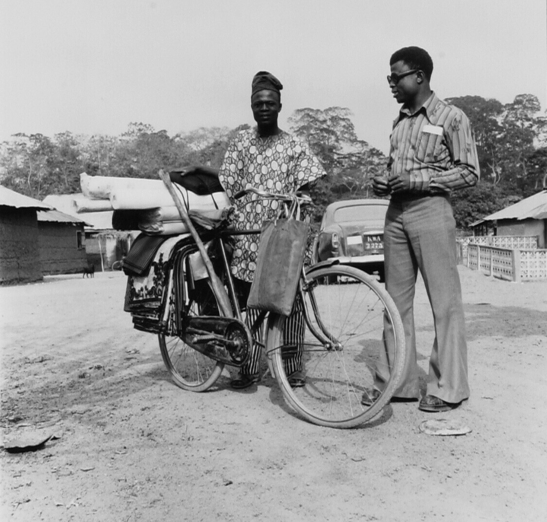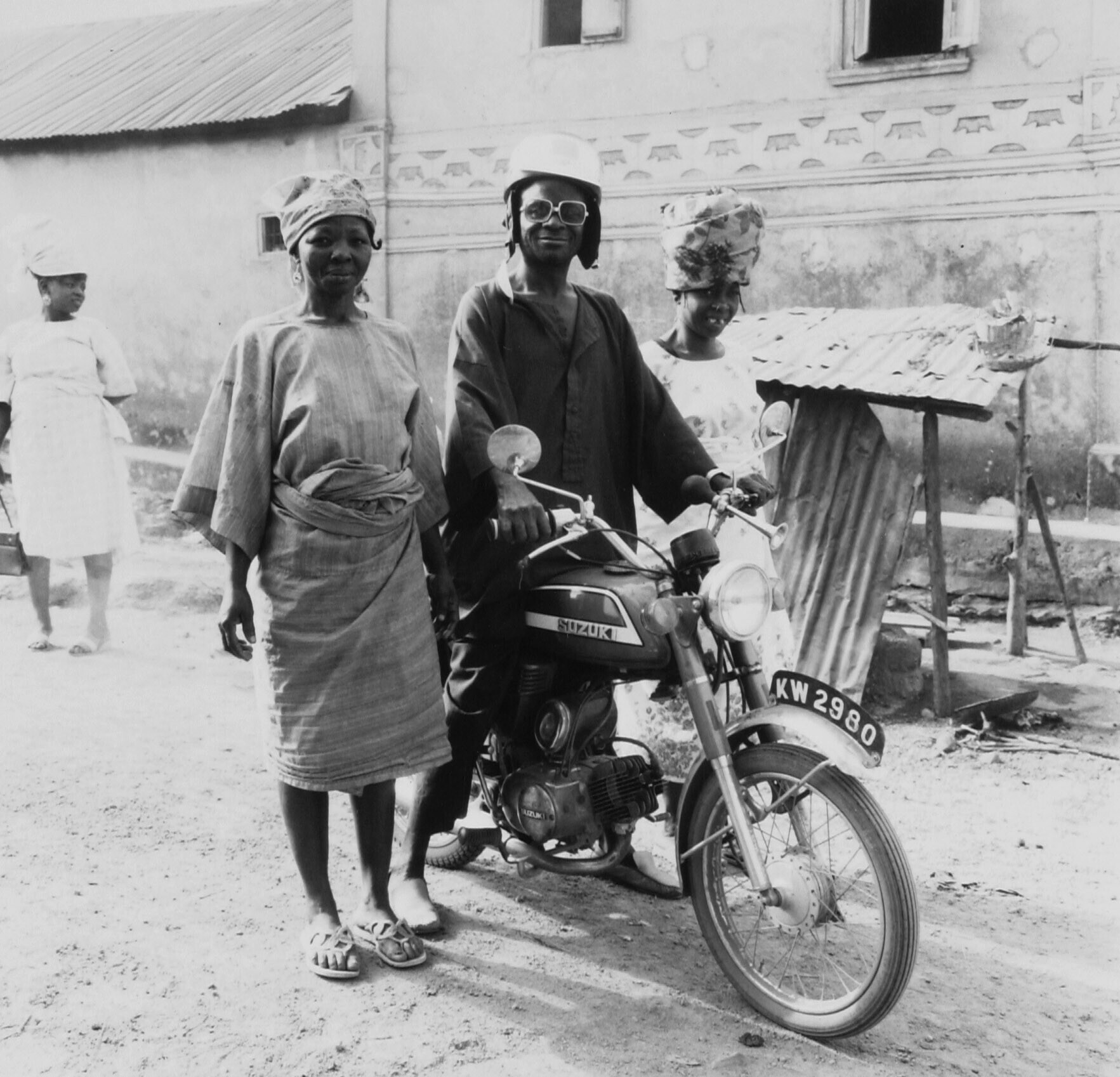 Een Yoruba man op zijn Suzuki geflankeerd door twee ...