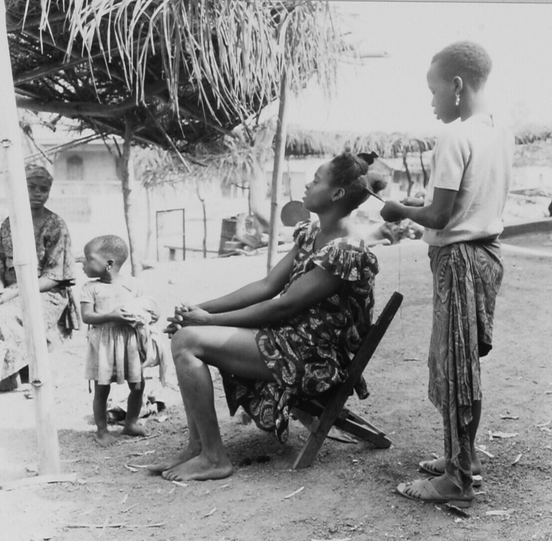 Het haar van een Yoruba vrouw wordt door een meisje ...