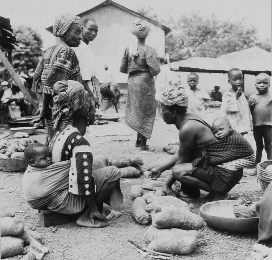 Vrouwen op de markt verkopen vermoedelijk yam, zoete...