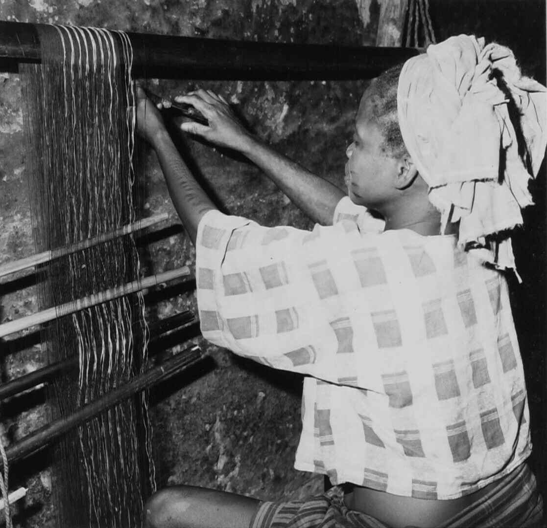 Een Yoruba vrouw bezig met het opspannen van de sche...