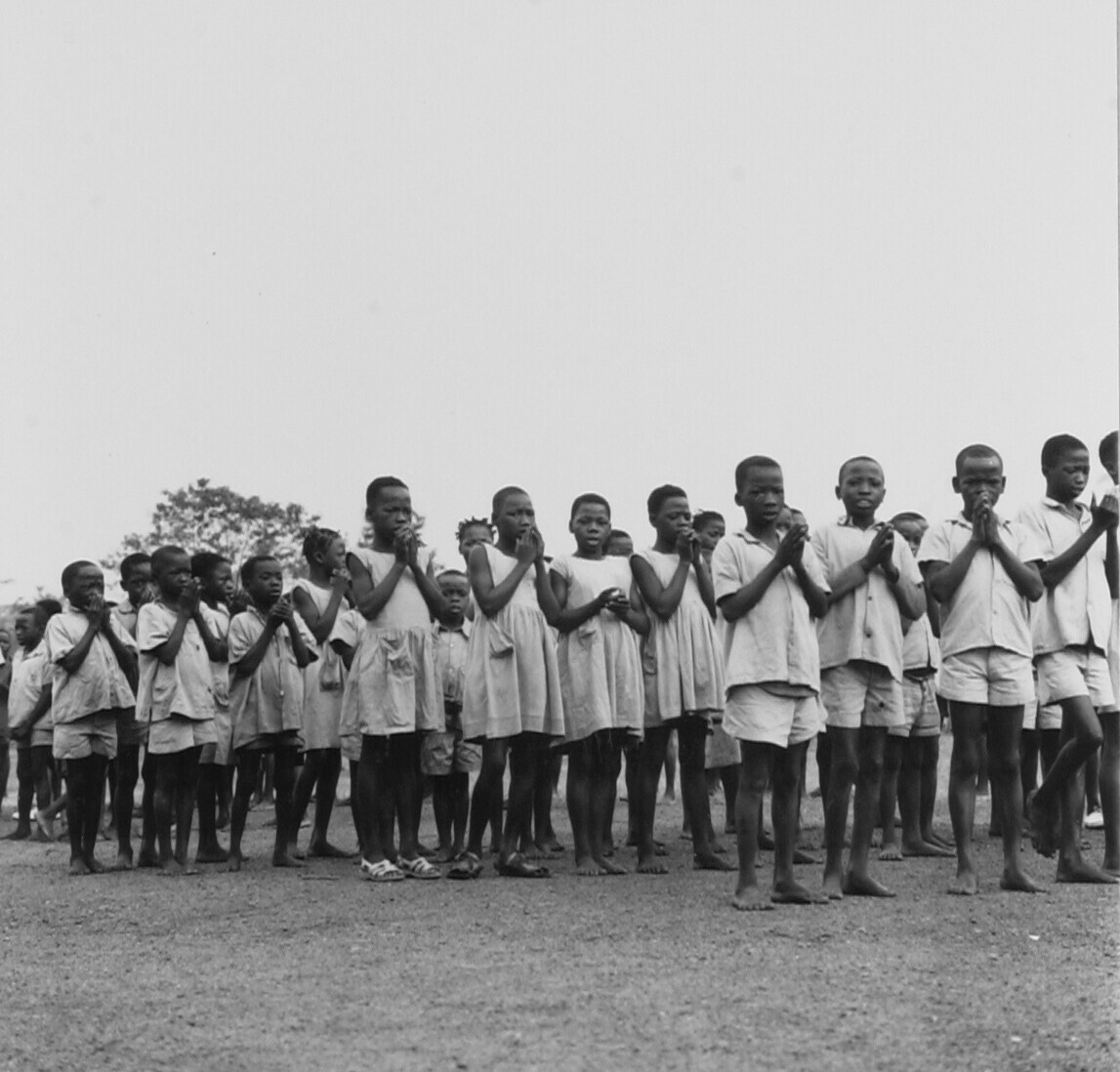 Schoolkinderen tijdens het gezamelijke gebed voorafg...