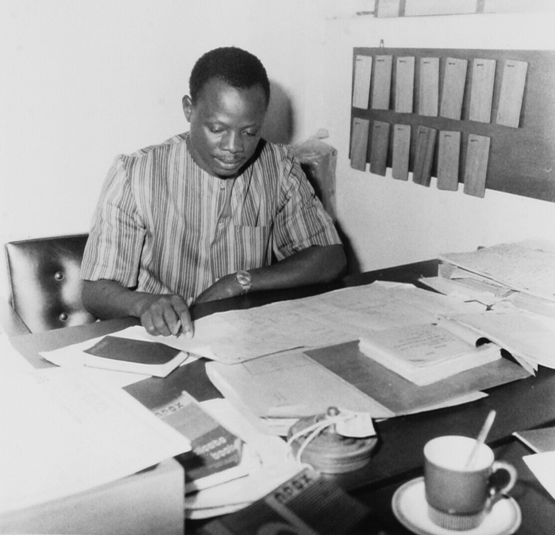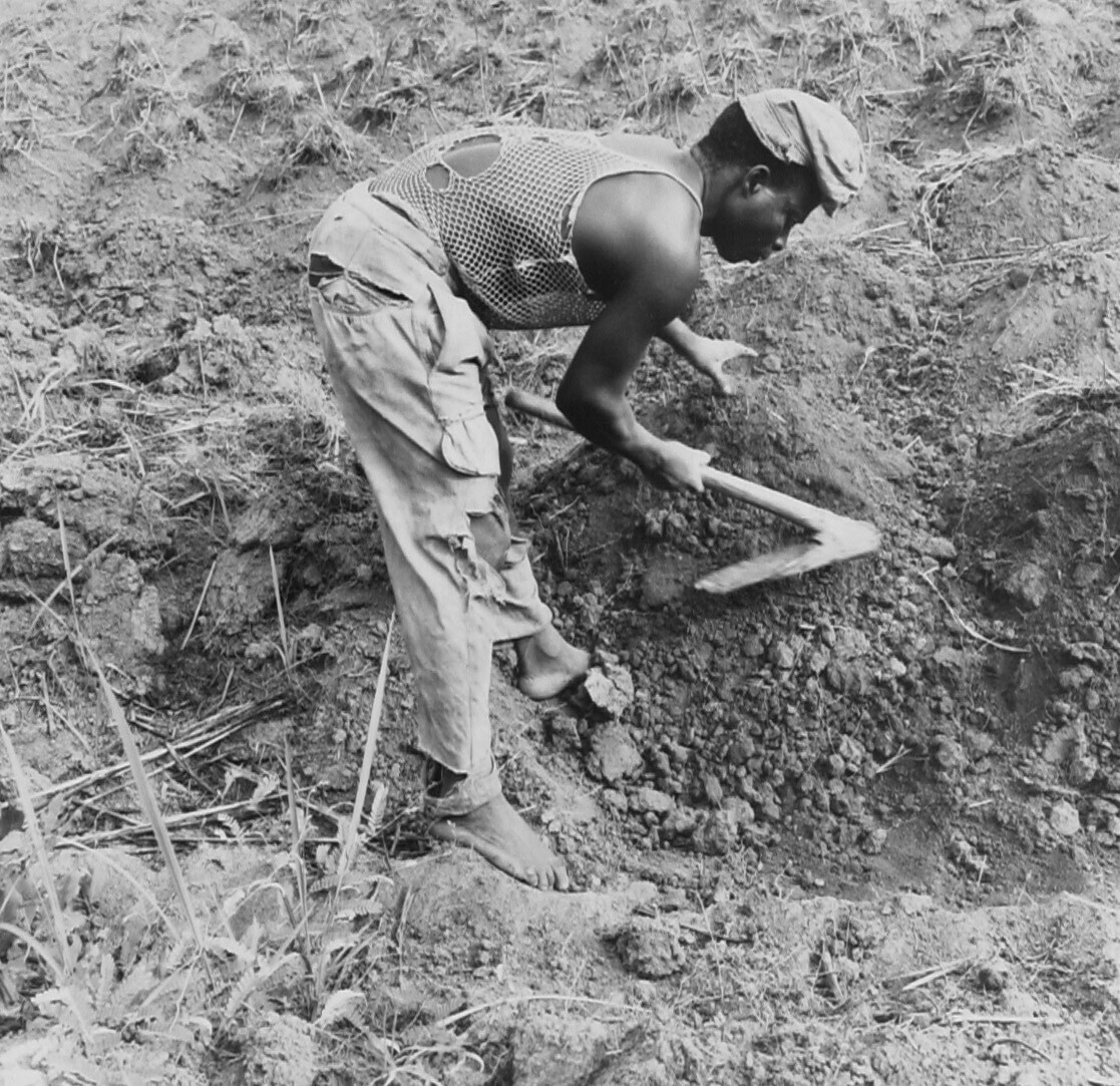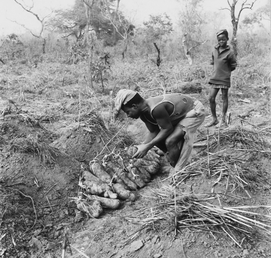 Een man besprenkelt yam knollen met Dieldrin wat de ...