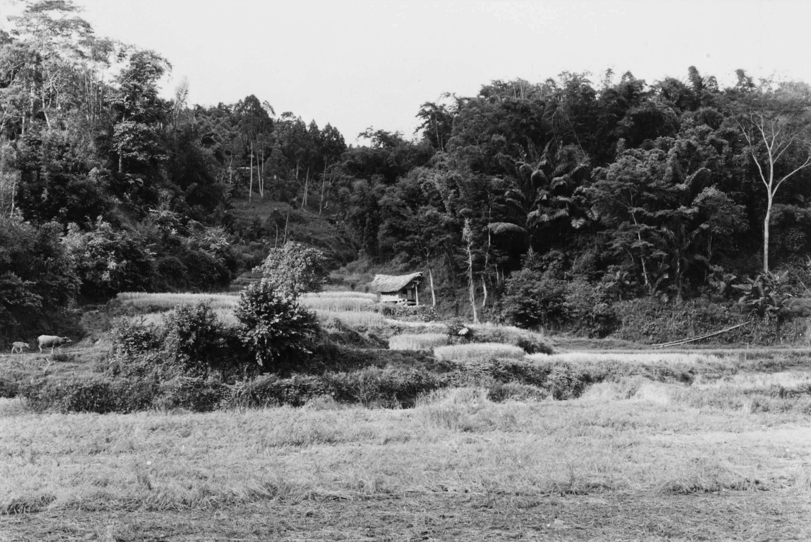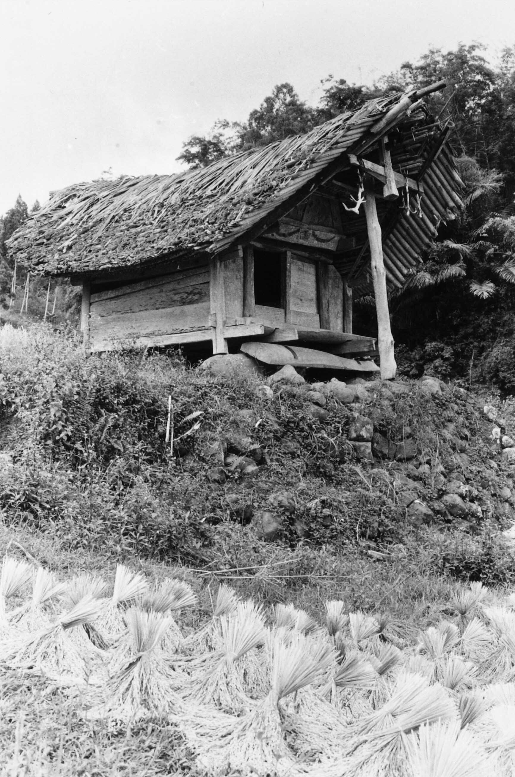 Een klein gebouw van waaruit de rijstvelden worden b...