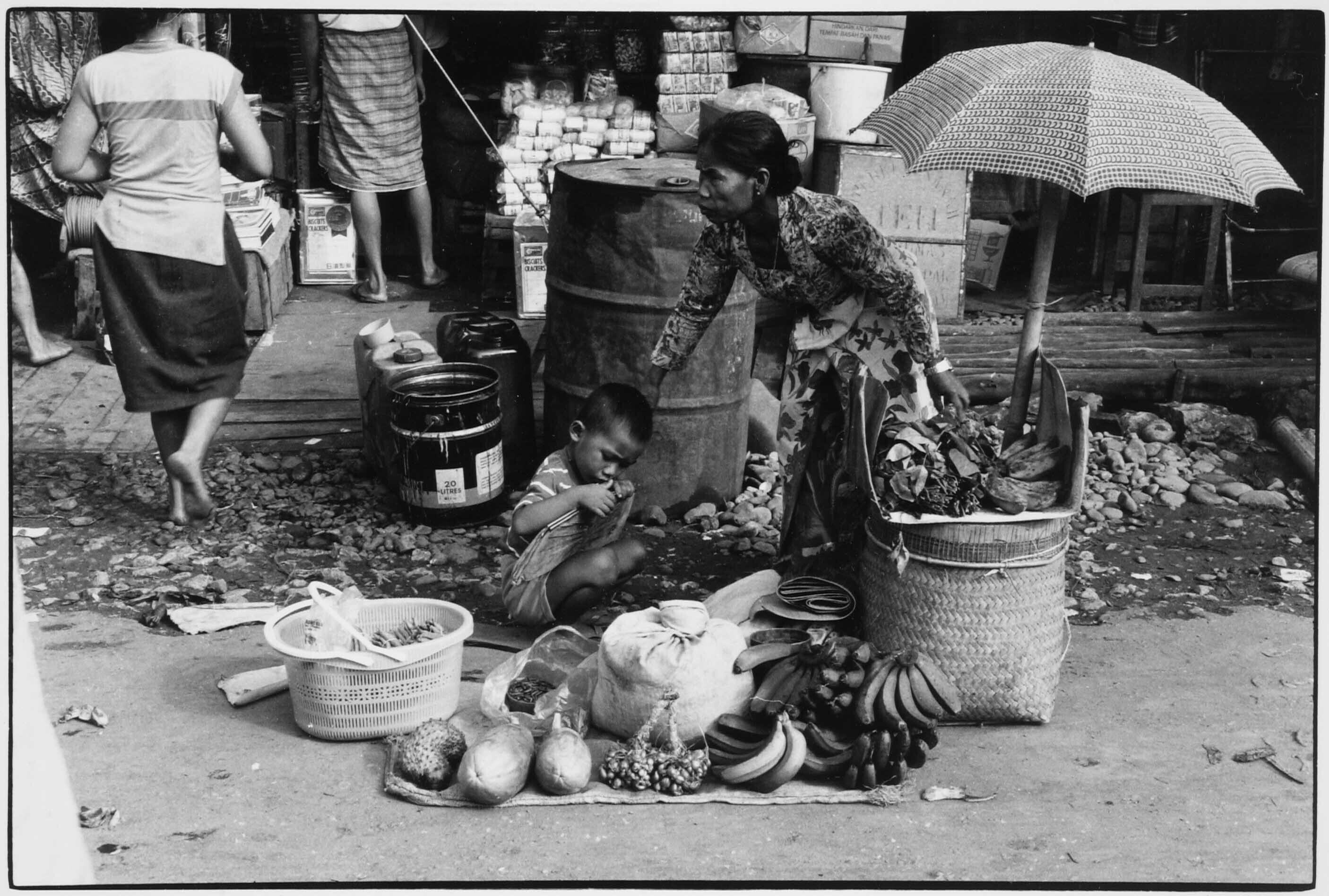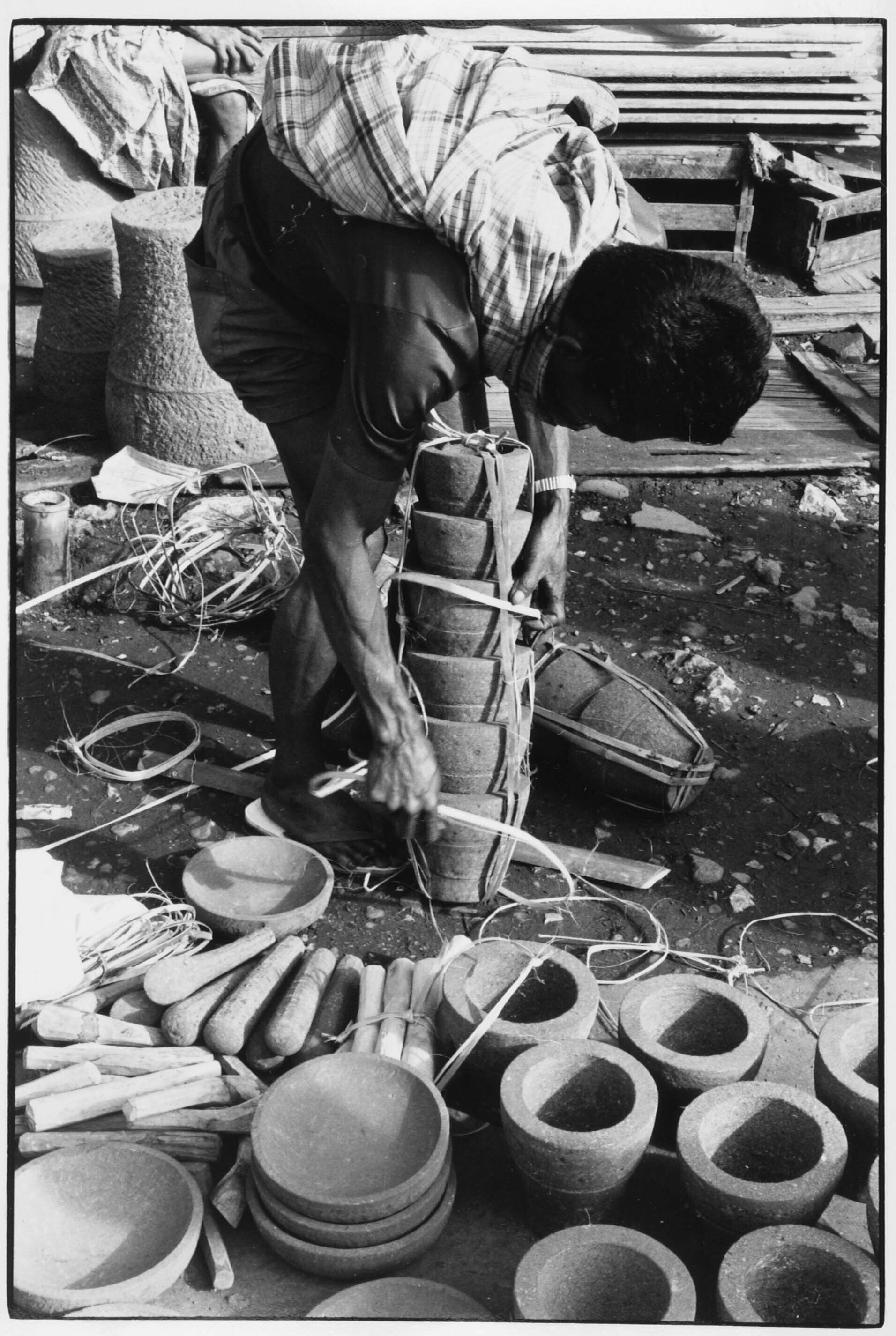 Een verkoper van vijzels is bezig zijn koopwaar uit ...