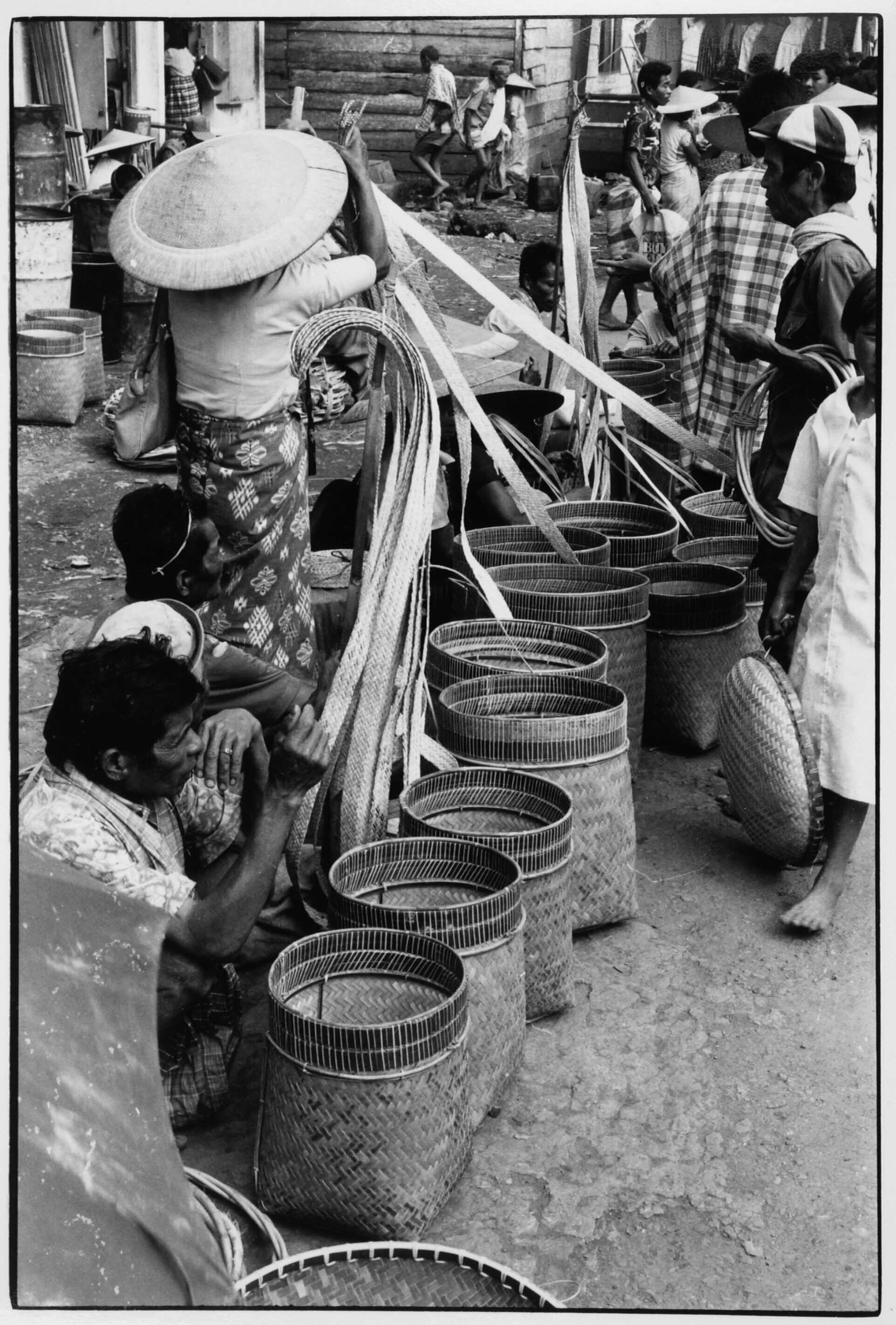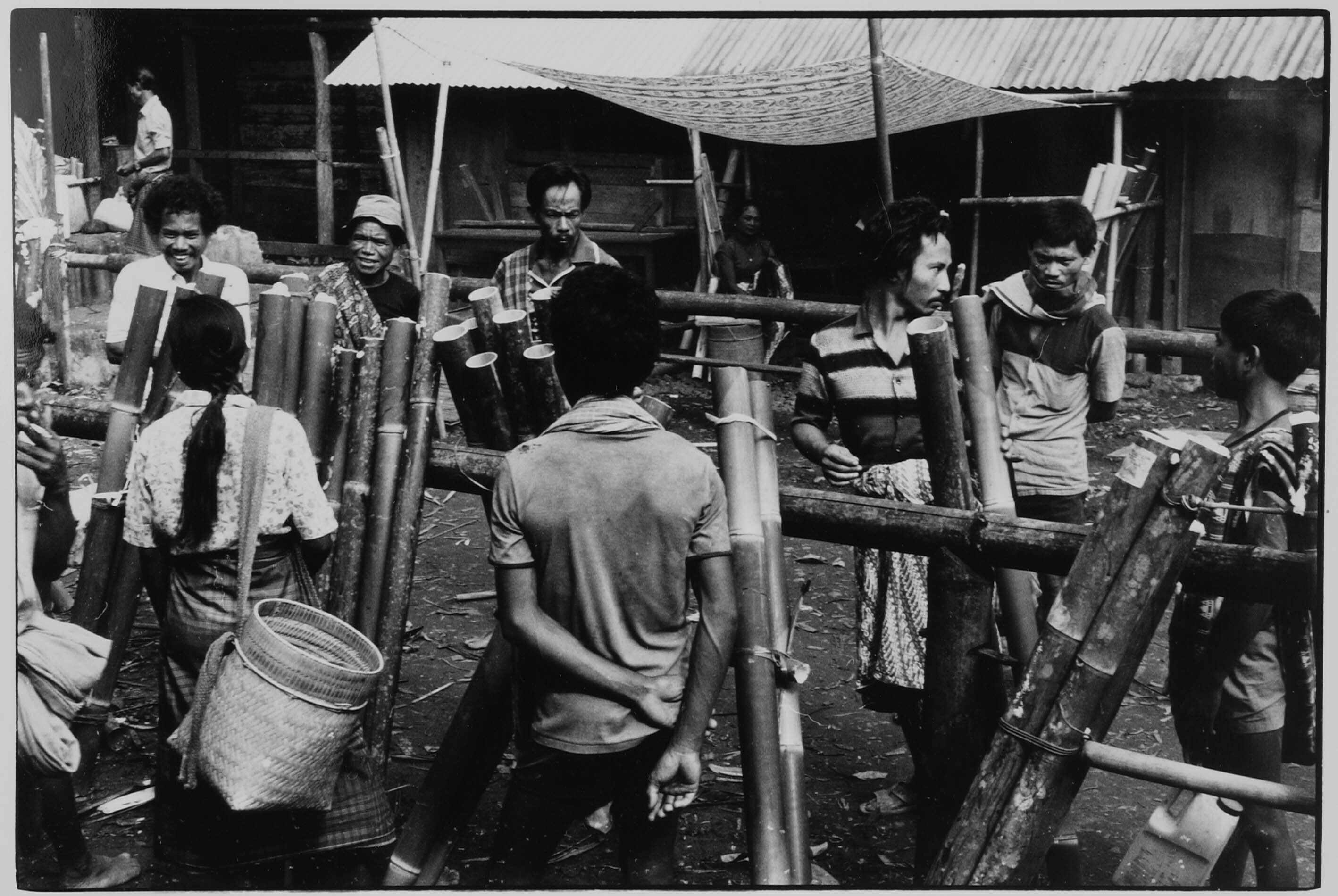 Verkoop van in bamboe verpakte palmwijn op de markt