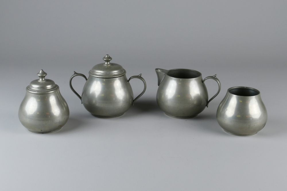 theeservies van tin, vervaardigd door Meeuws en Zoon...