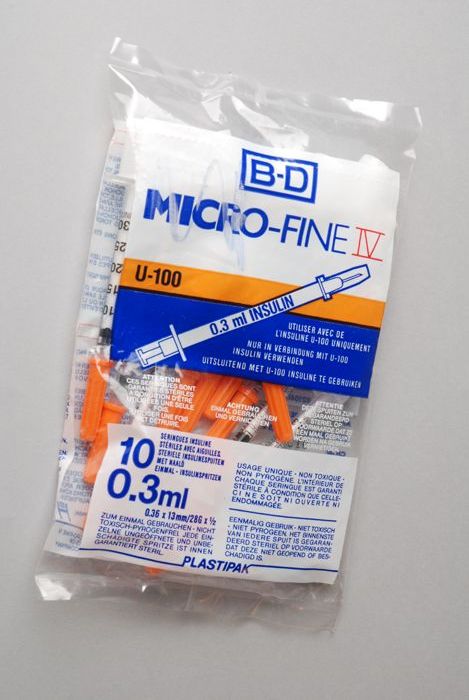 Zakje met tien steriele injectiespuiten, "B-D / MICR...