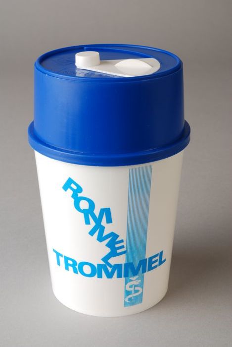 Witte kunststof bus met in blauwe letters "ROMMELTRO...