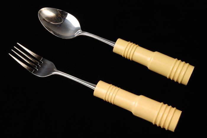 Gebogen lepel en vork, met verdikt grijs handvat