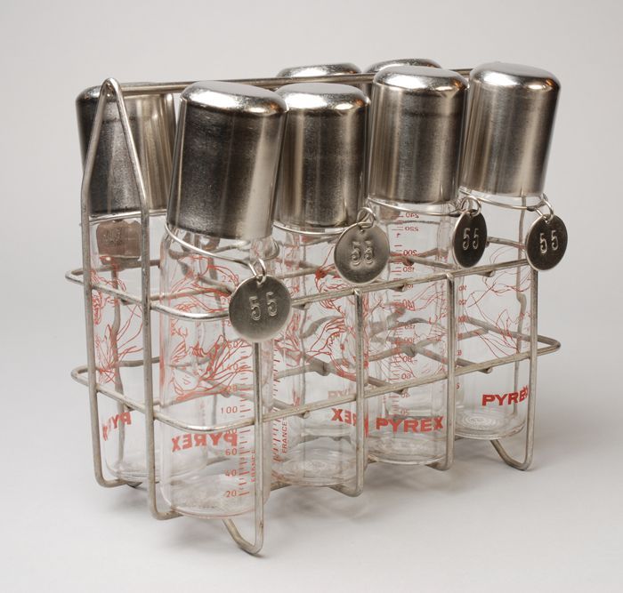 Metalen draagrek met acht flessen "pyrex" met losse ...