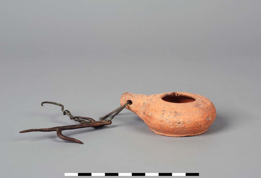 Olielamp van aardewerk met een lamphaak van brons ui...