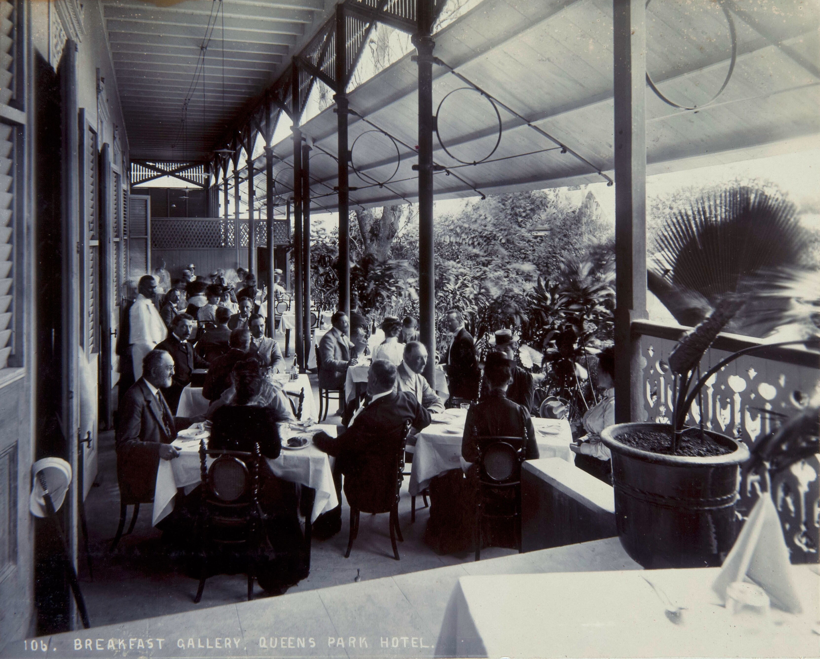 Gasten op de veranda van Queen's hotel