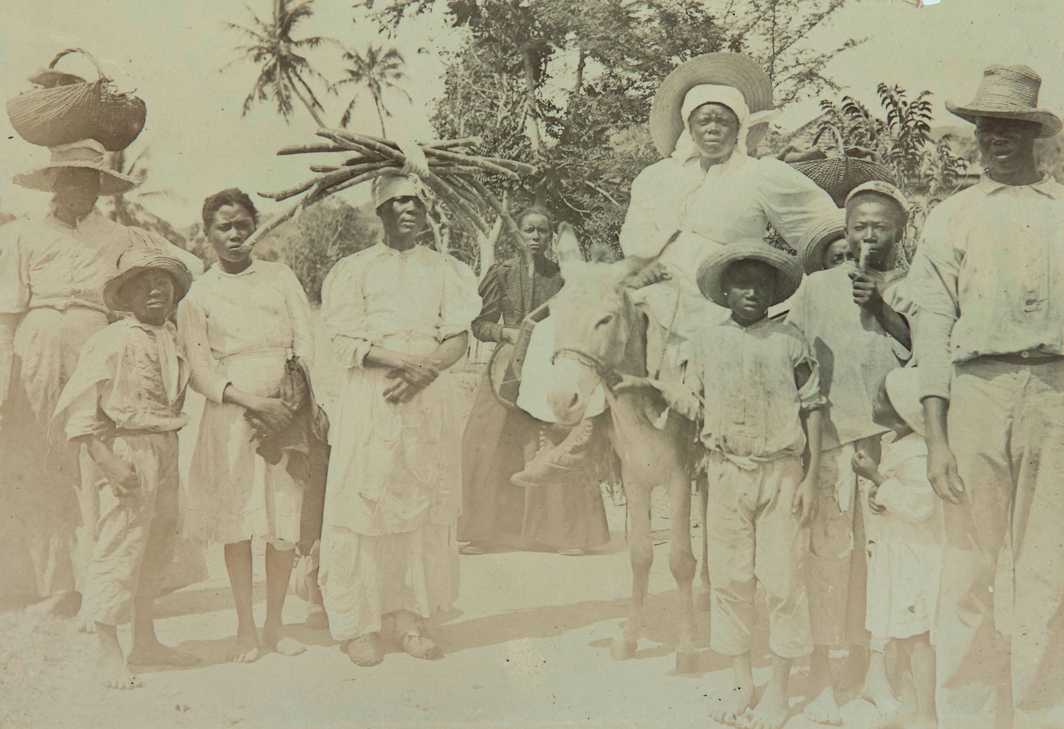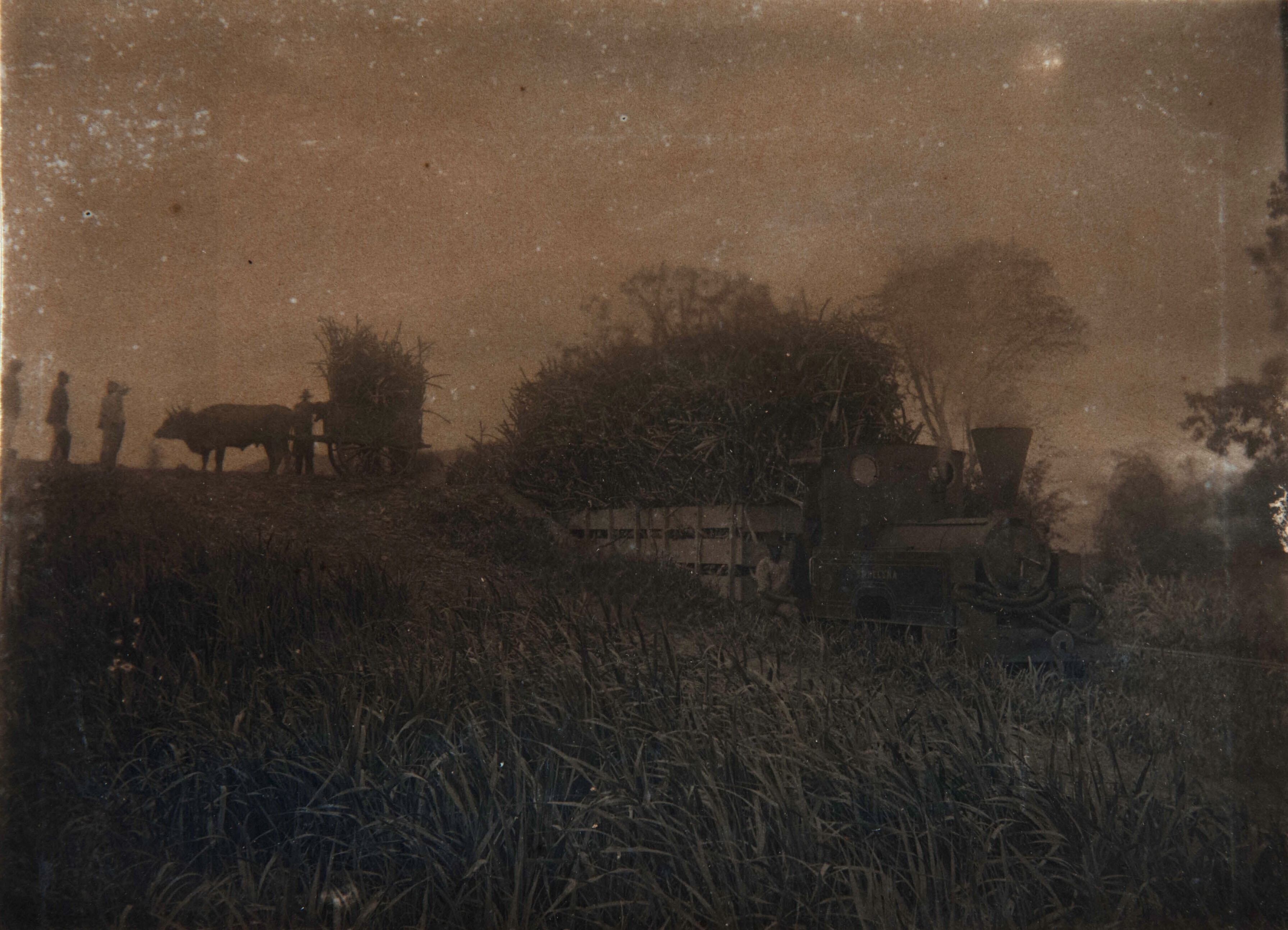 Suikerriet wordt van ossenkar op treinwagon geladen