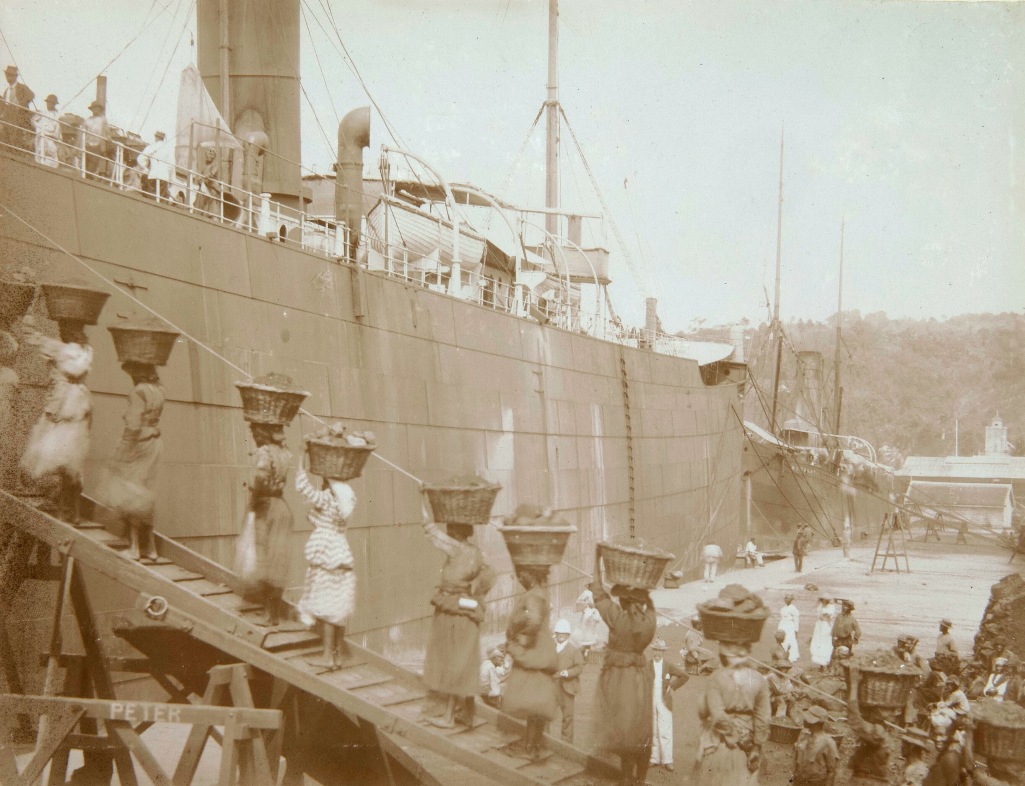 Het laden van kolen aan boord van een stoomschip met...