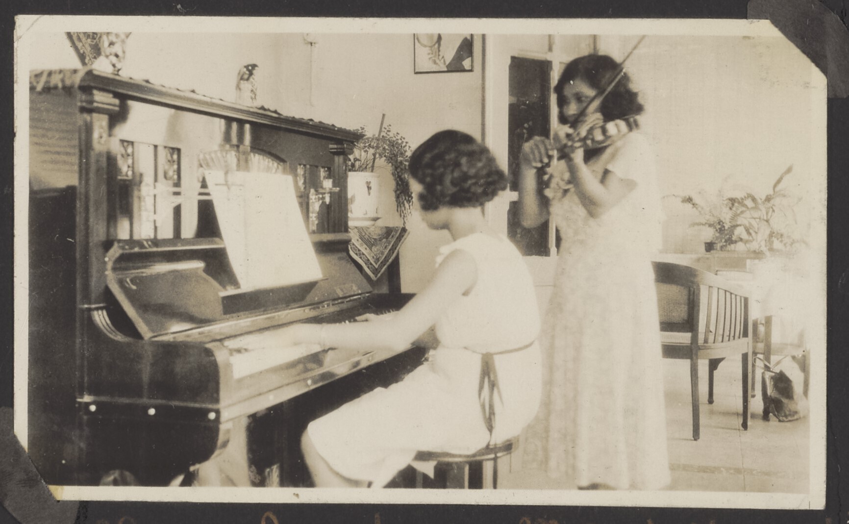 Twee Indo-Europese meisjes spelen piano en viool in ...
