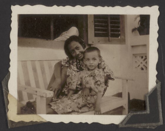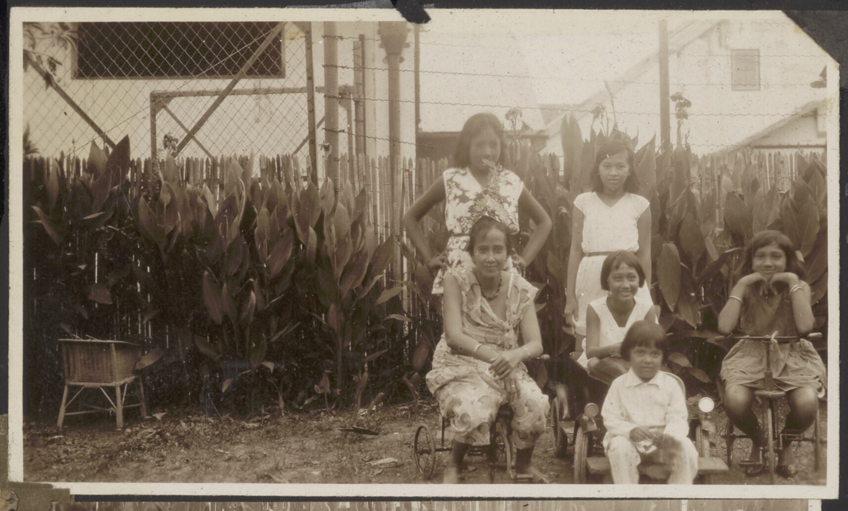 Een Indo-Europese vrouw met kinderen in het pension ...