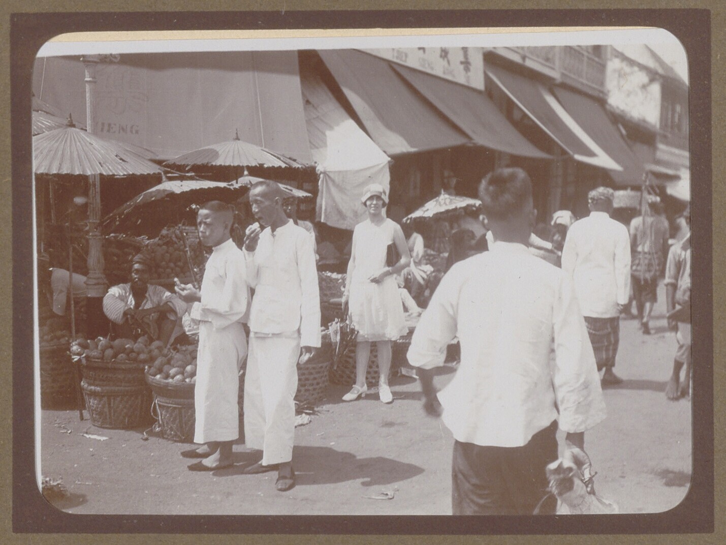 Eetstalletje, warenverkopers en Europese man