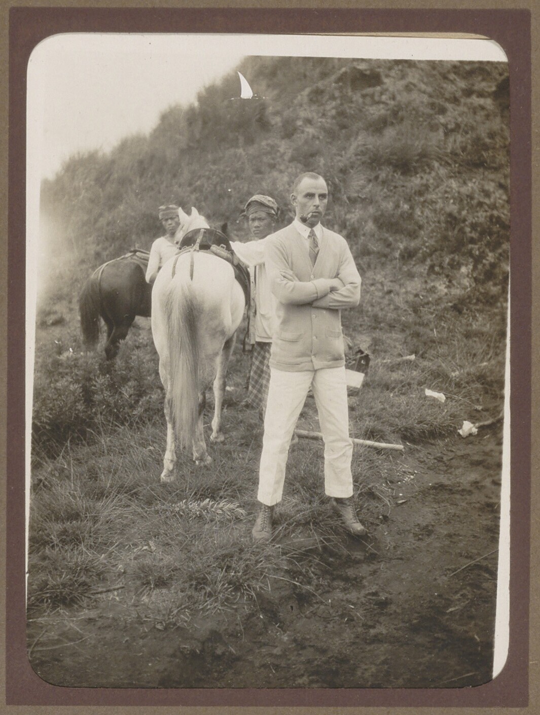 Europese man en twee Javanen met paarden