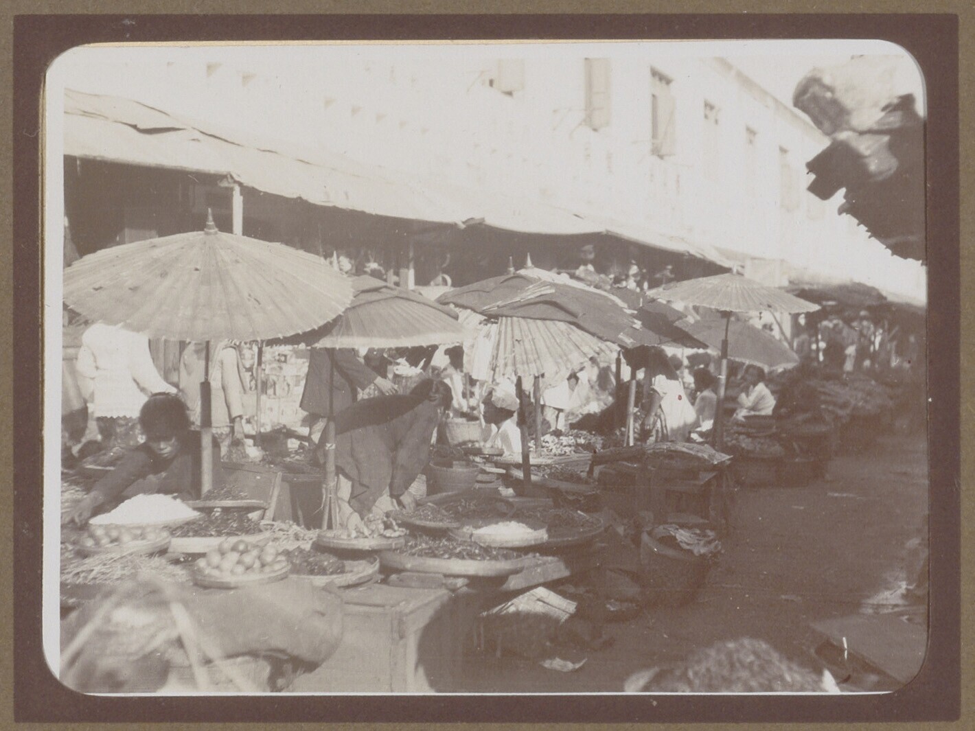 Marktstalletjes met manden en verkopers