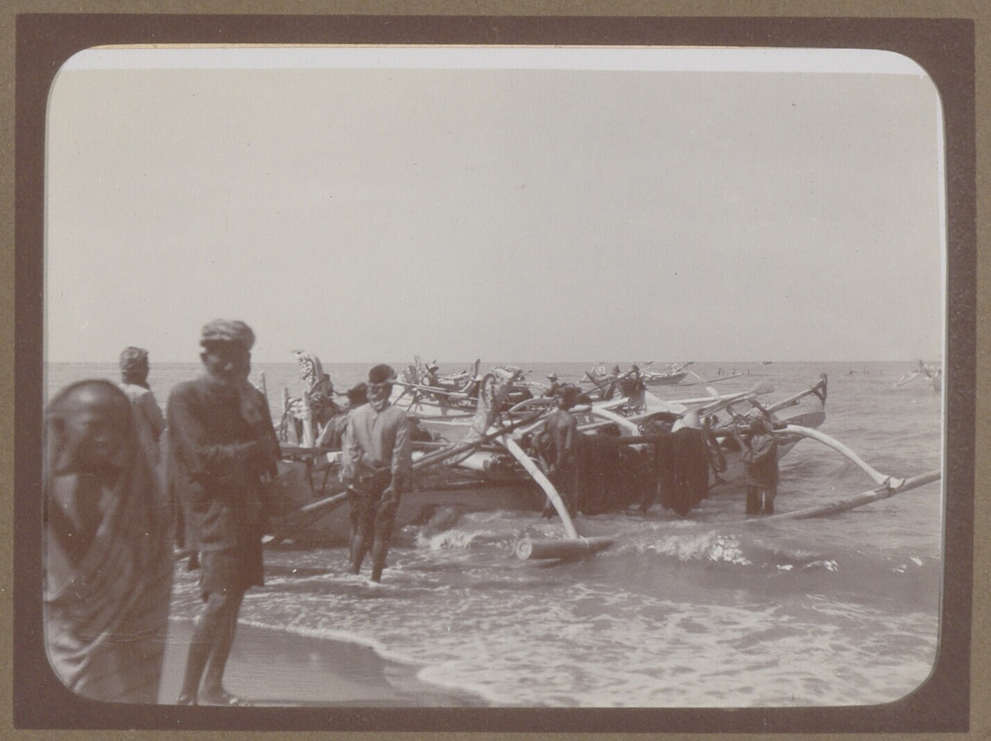 Prauw met uitleggers aan beide zijden, op zee met vi...