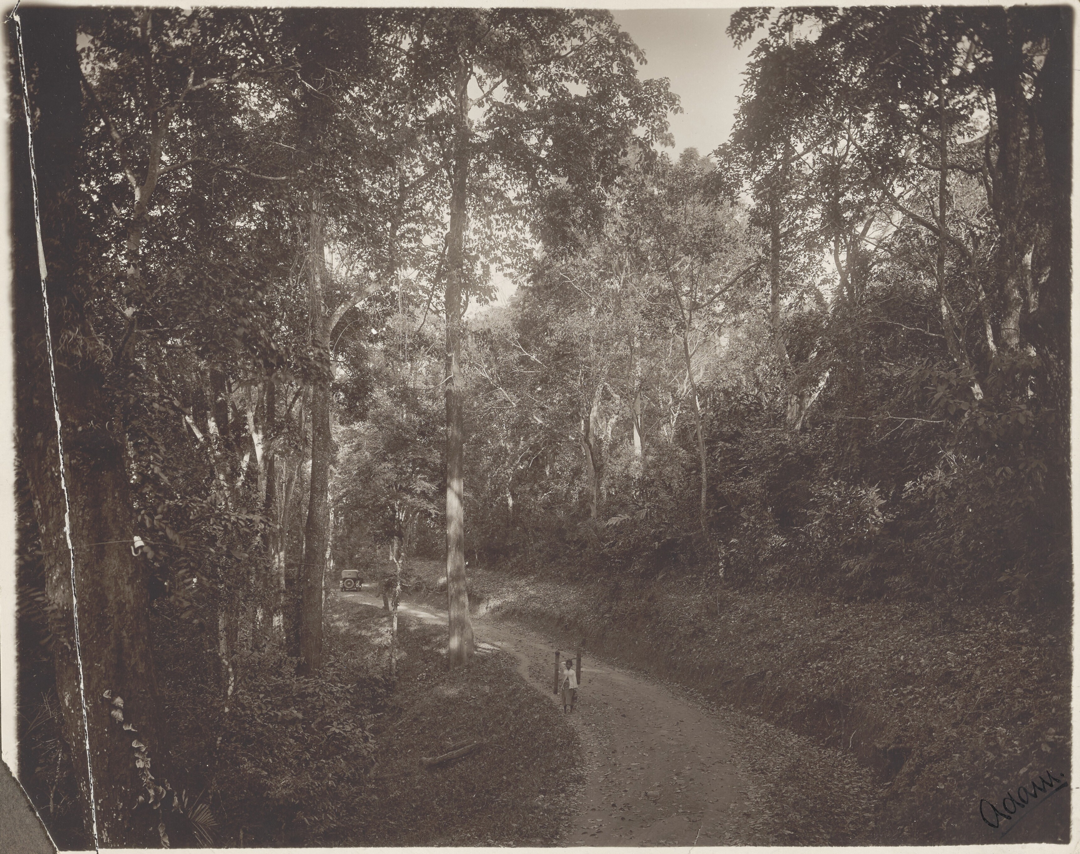 Weg door een bos met Javaanse vrouw en een auto