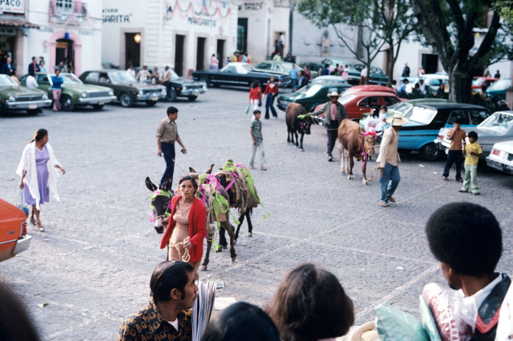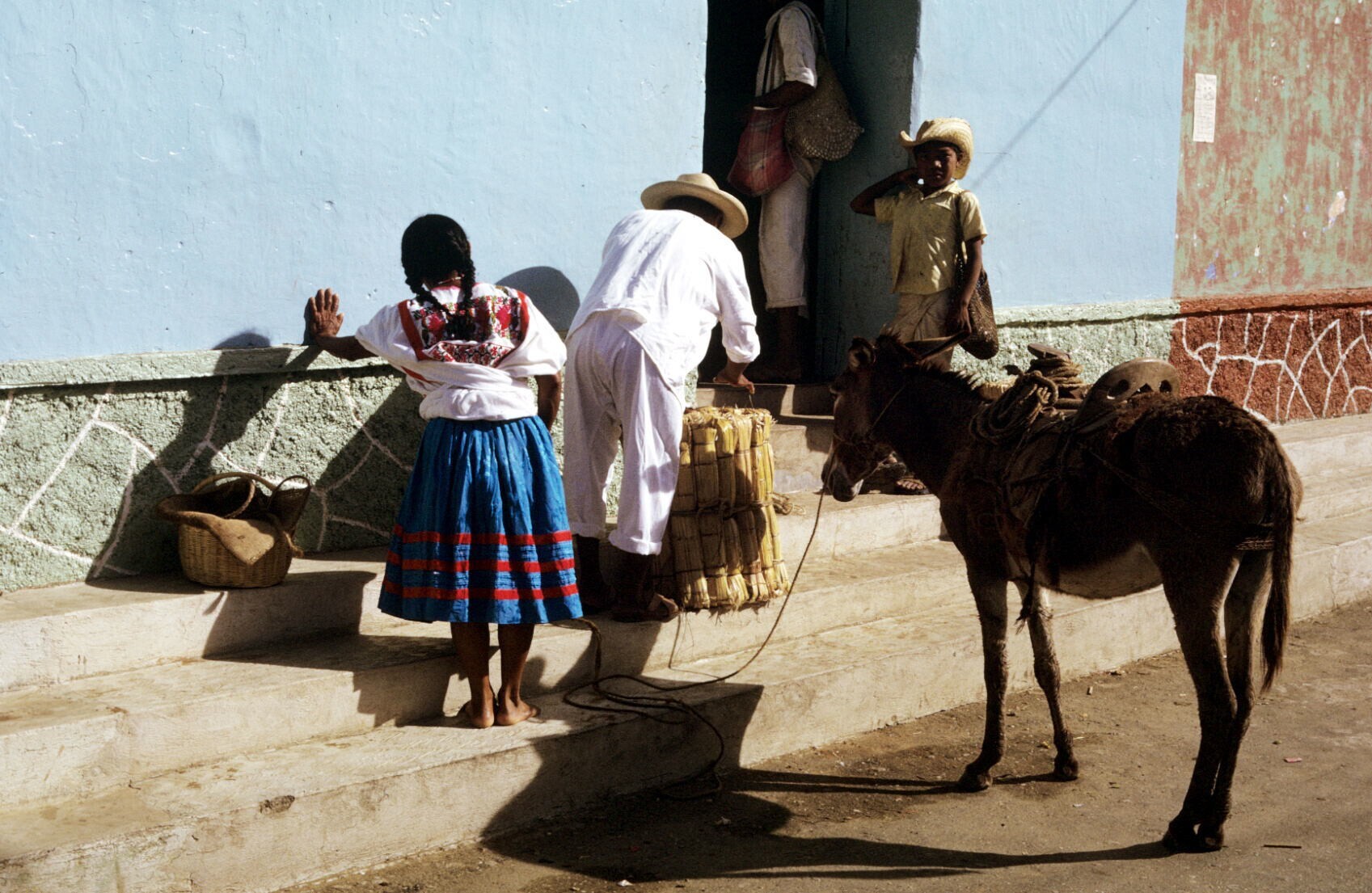vrouw op markt, met man en ezel
