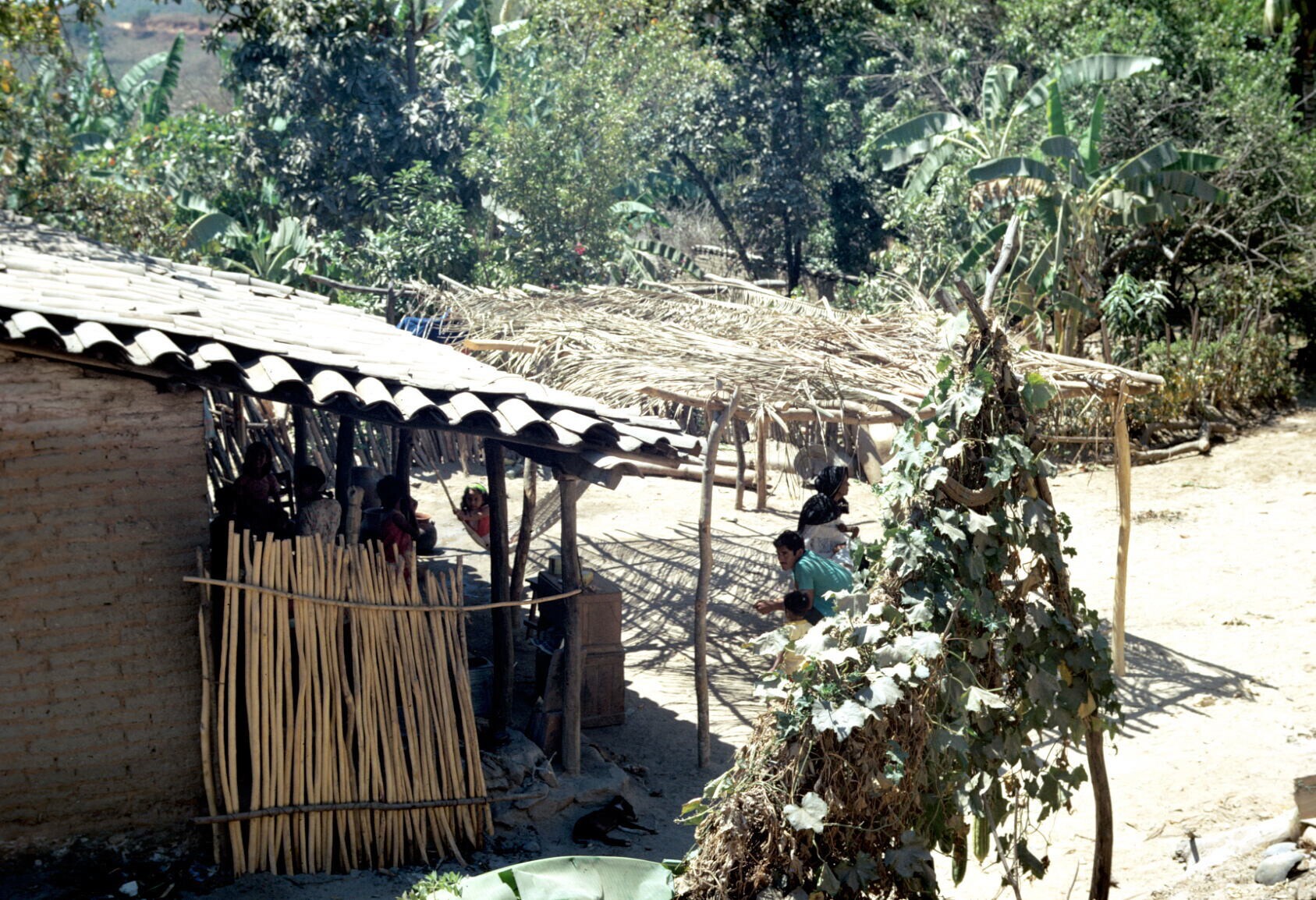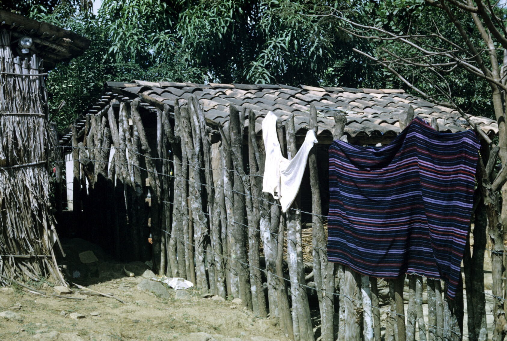 chozas (hutten) met te drogen hangende wikkelrok en ...