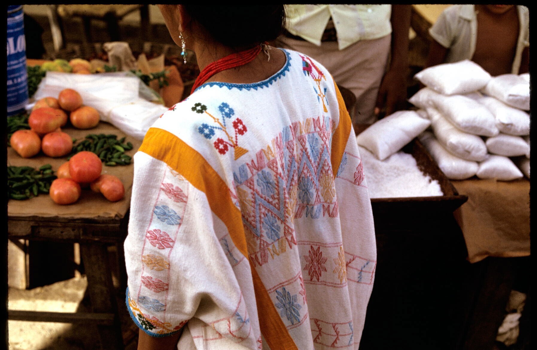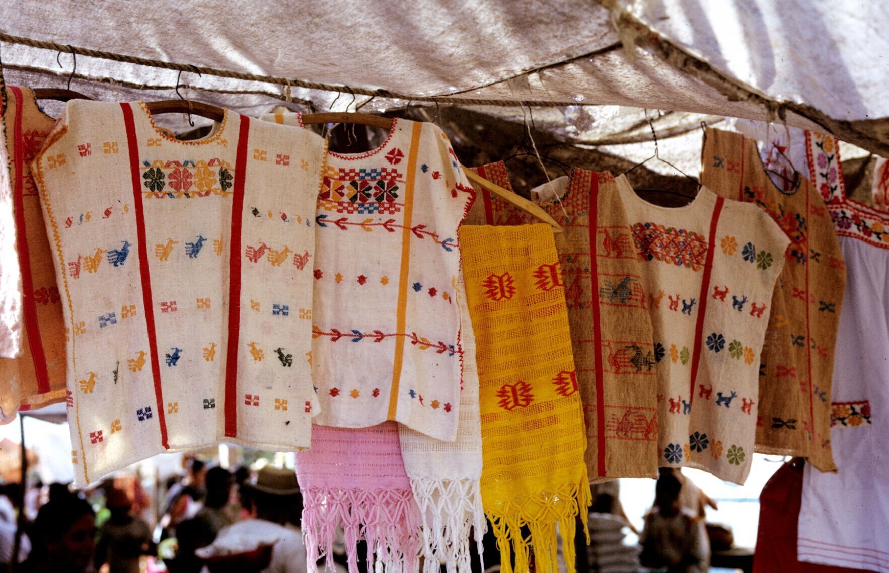 Amusgo huipiles (jurken) in marktkraam