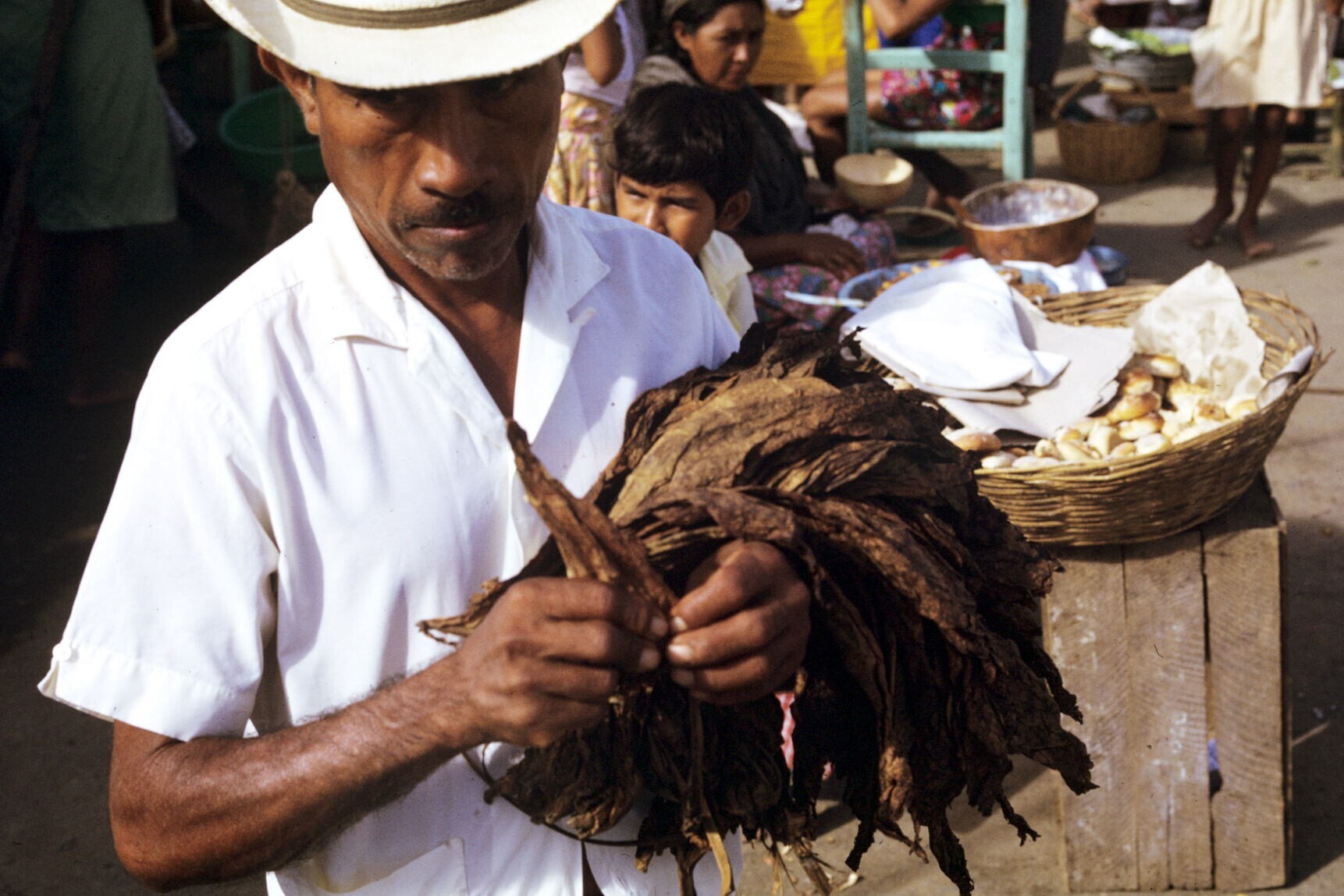 man met tabaksbladeren op markt