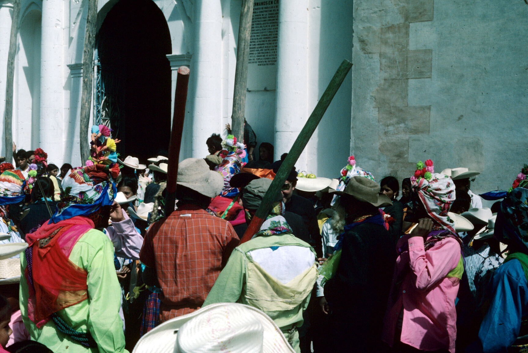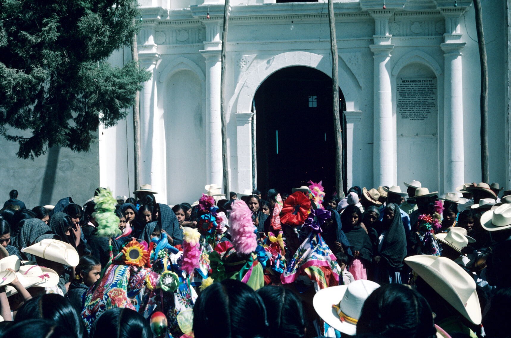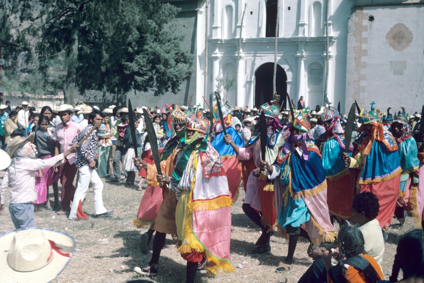 dansers van 'moros y cristianos' en publiek bij kerk