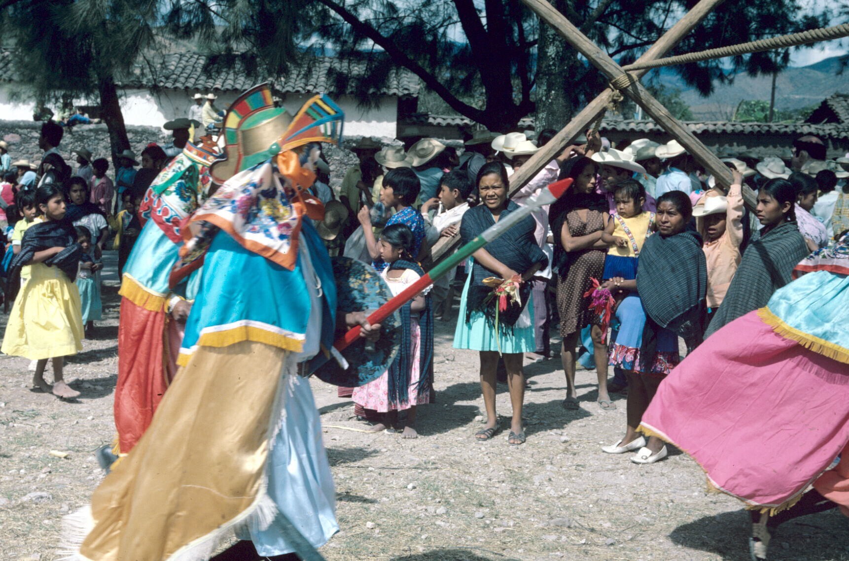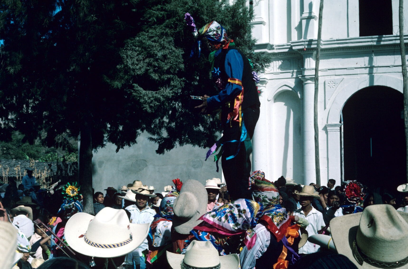 'maromero' (koorddanser) en publiek bij kerk