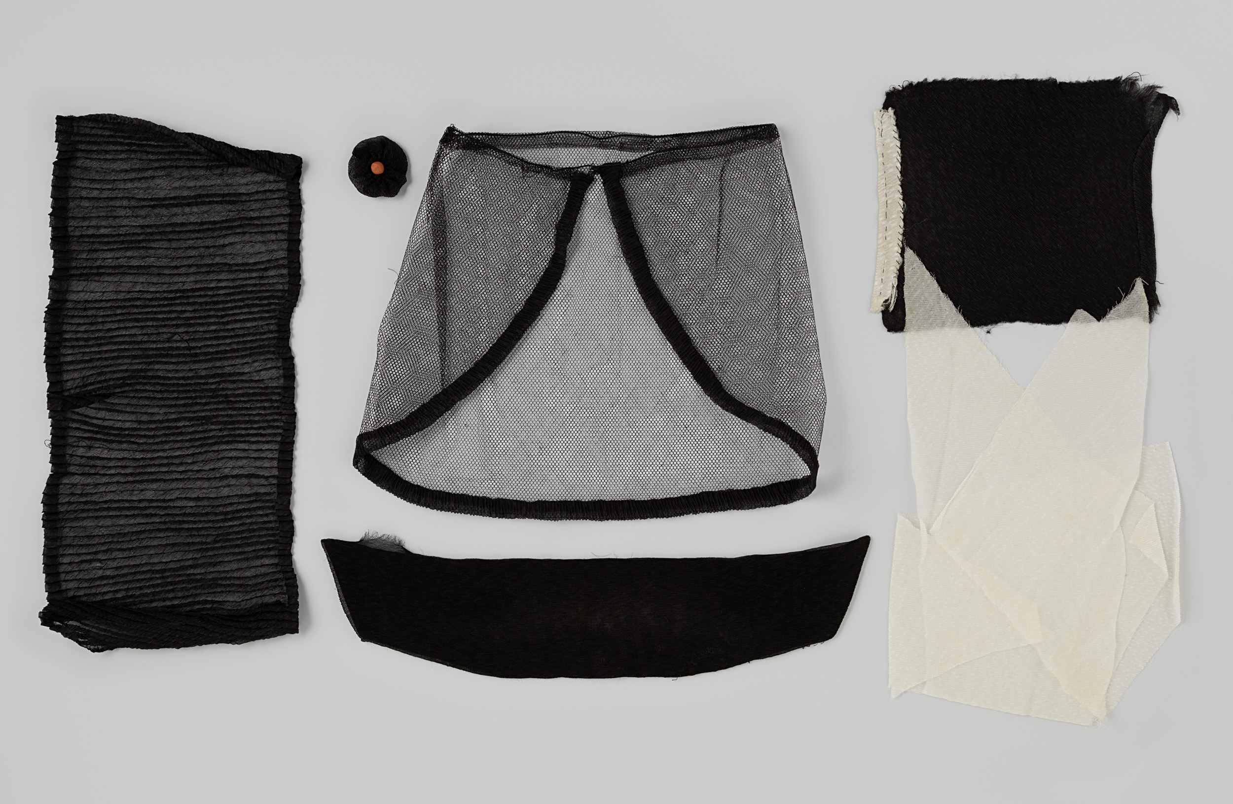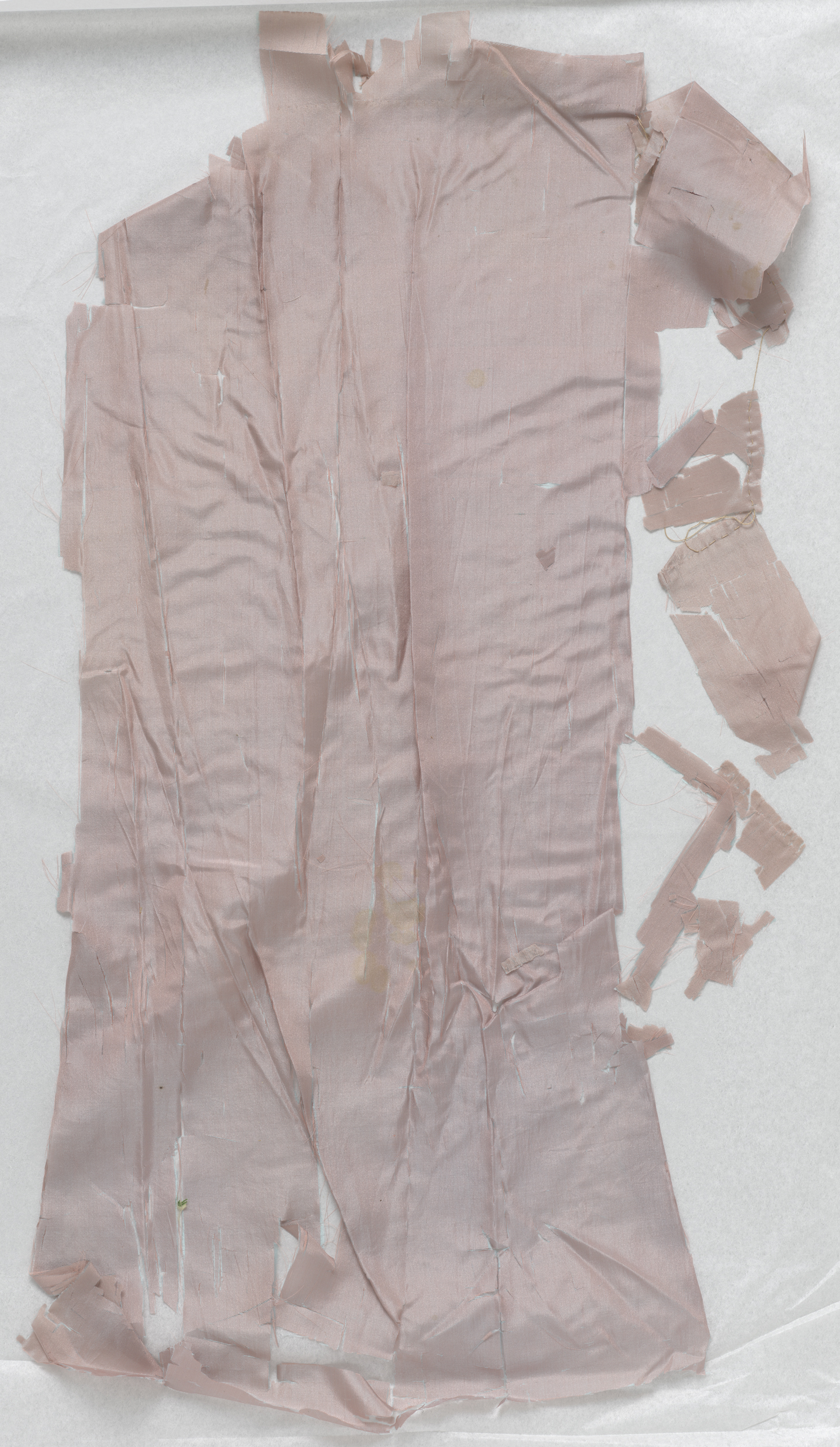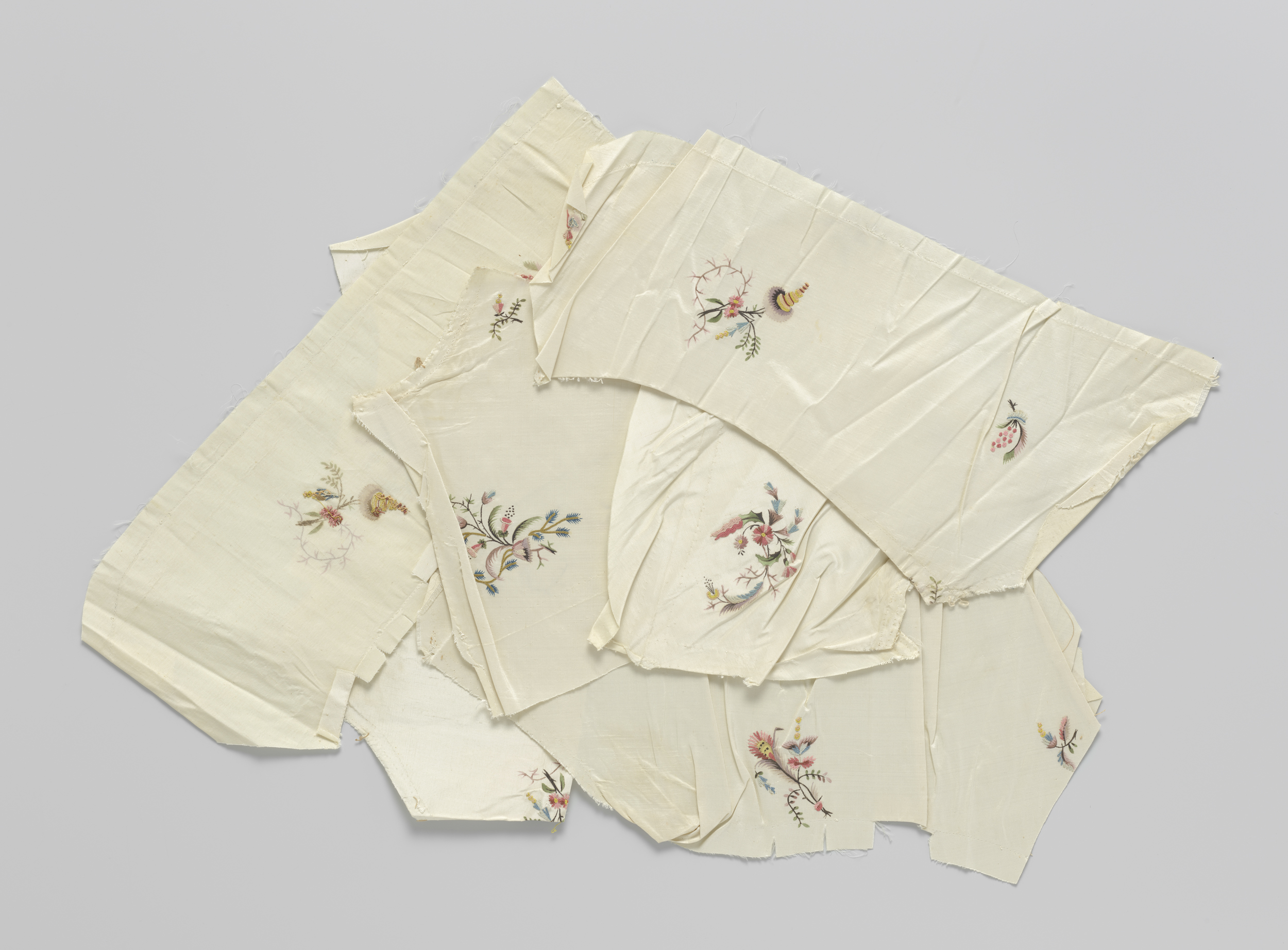 Fragmenten, zes stuks, van wit textiel met opdruk en...