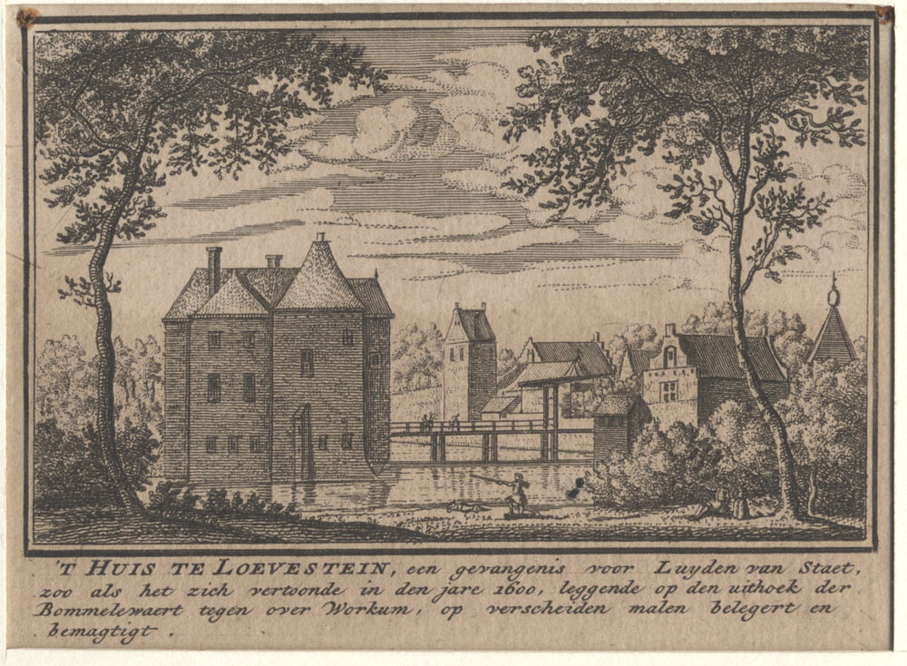 Gezicht op slot Loevestein met brug en bijgebouwen e...