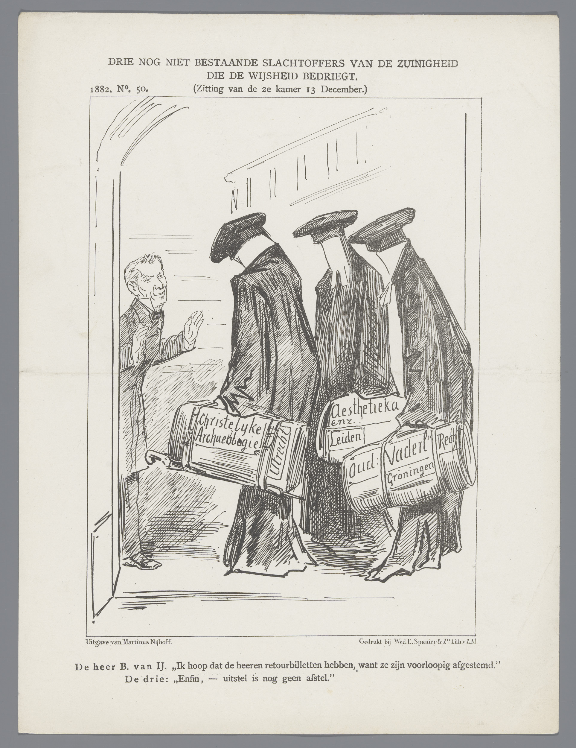 Spotprent bij de invoering van de nieuwe spelling, 1883