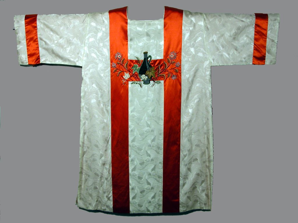 Witte dalmatiek met oranje friezen waarop kruis met ...