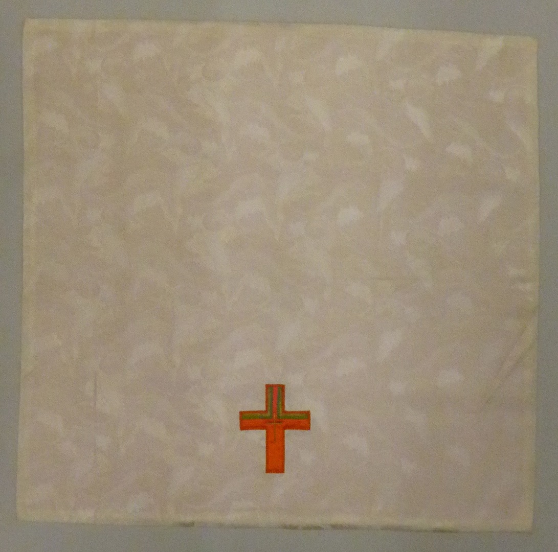 Wit kelkvelum met ingeweven bladmotief, rood kruisje