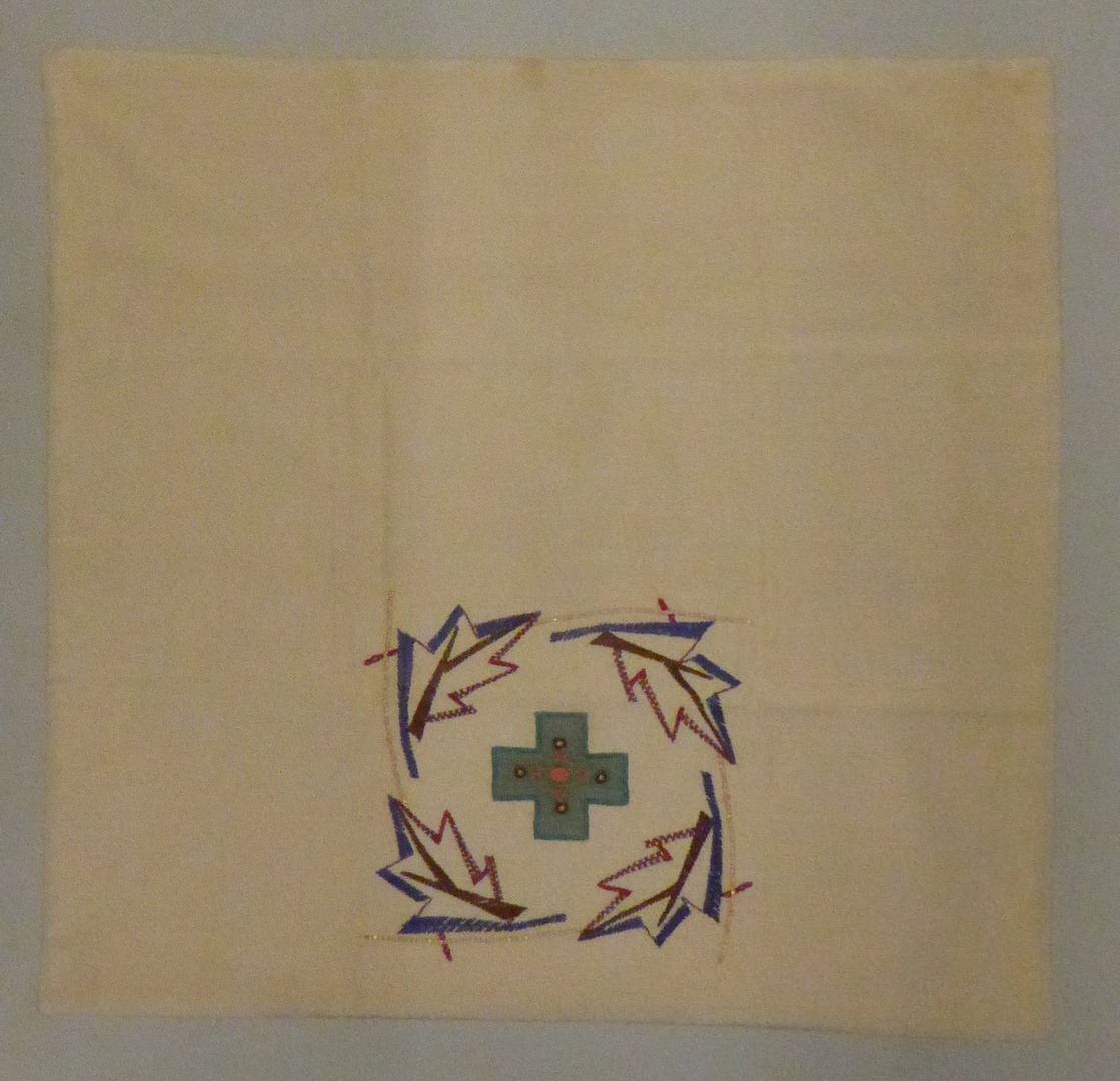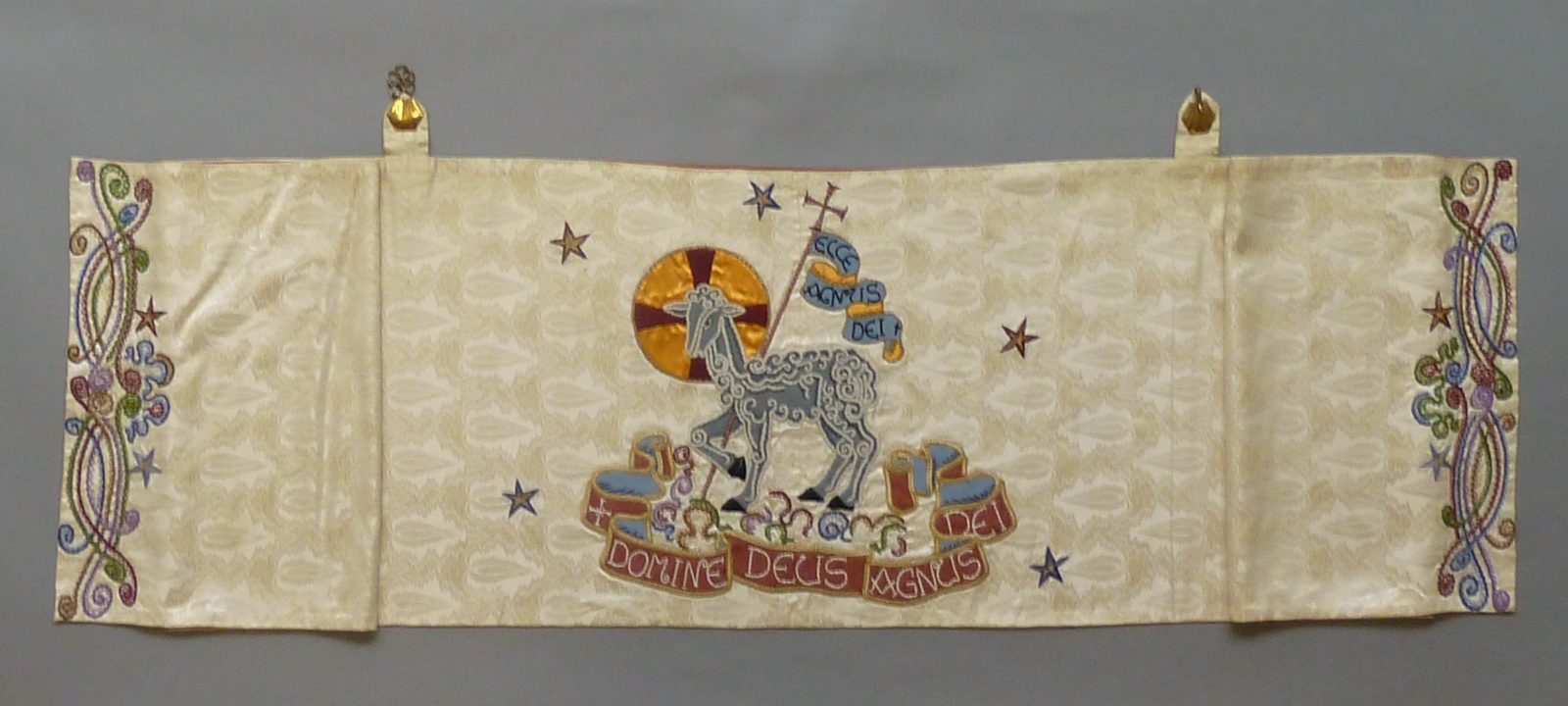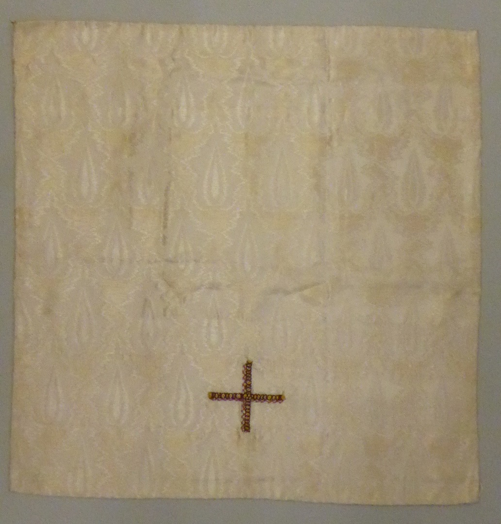 Wit kelkvelum met blauw kruis omringd door geborduur...