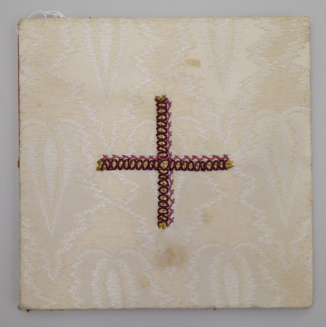 Wit velum met ingeweven vlammotief, goud-paars kruisje