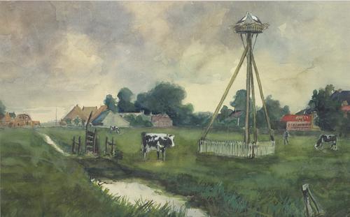 Aquarel van een ooievaarsnest bij de Houtlaan met zi...