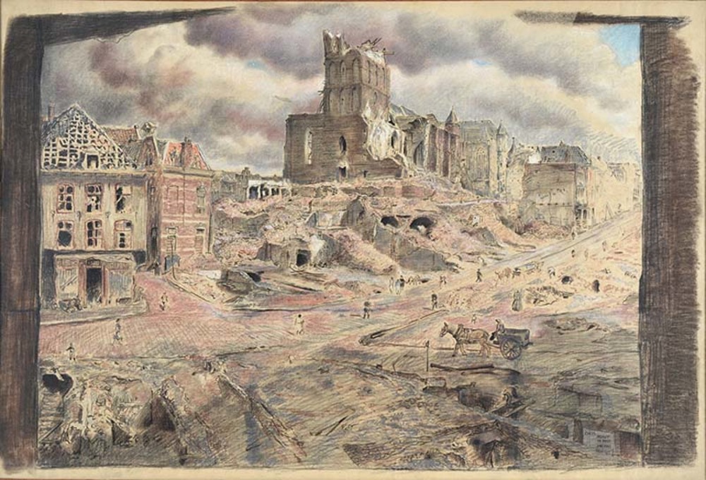 Verwoeste Stevenstoren en gebombardeerde huizen