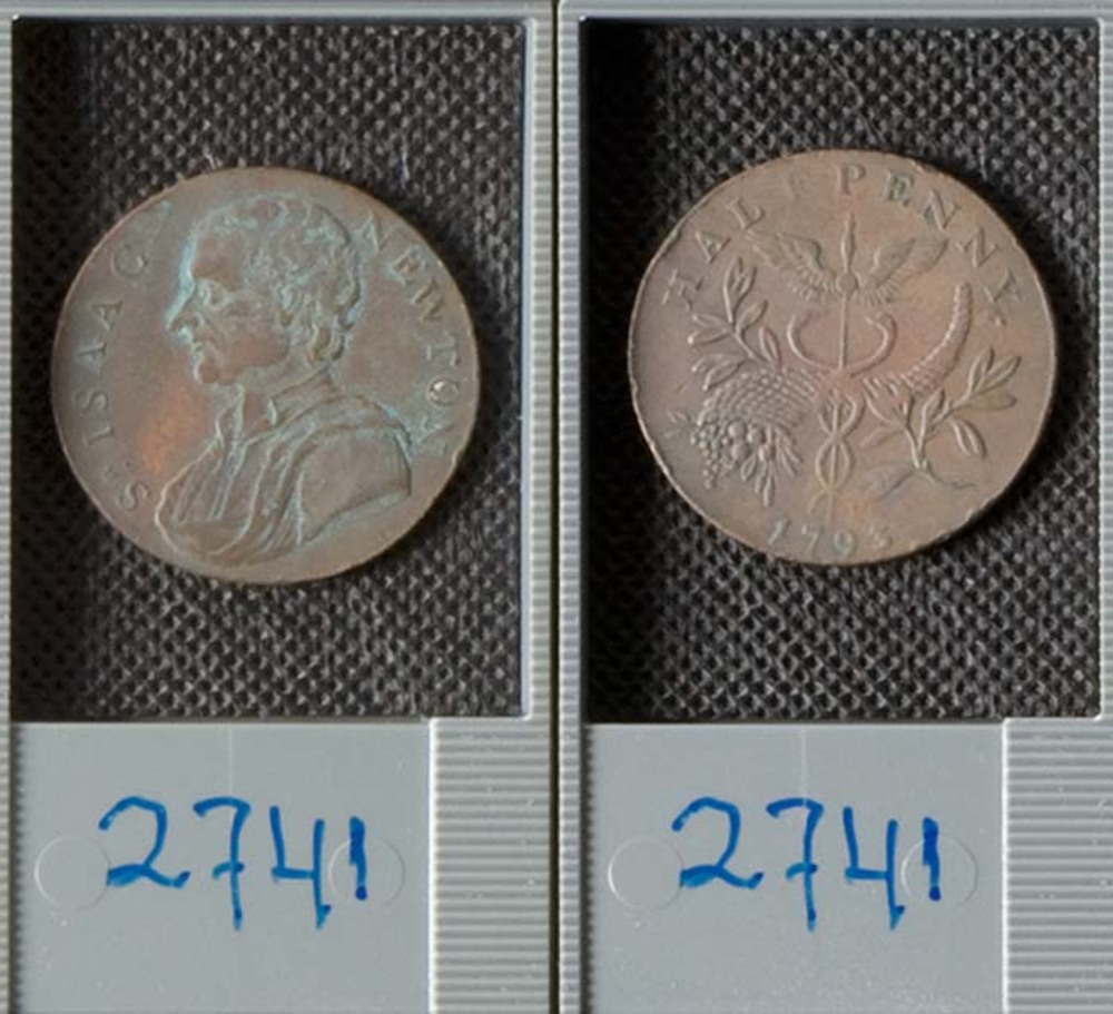 Halfpenny met afbeelding van Sir Isaac Newton
