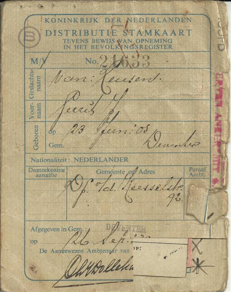 Distributiestamkaart op naam van Van Leusen Gerrit Jan