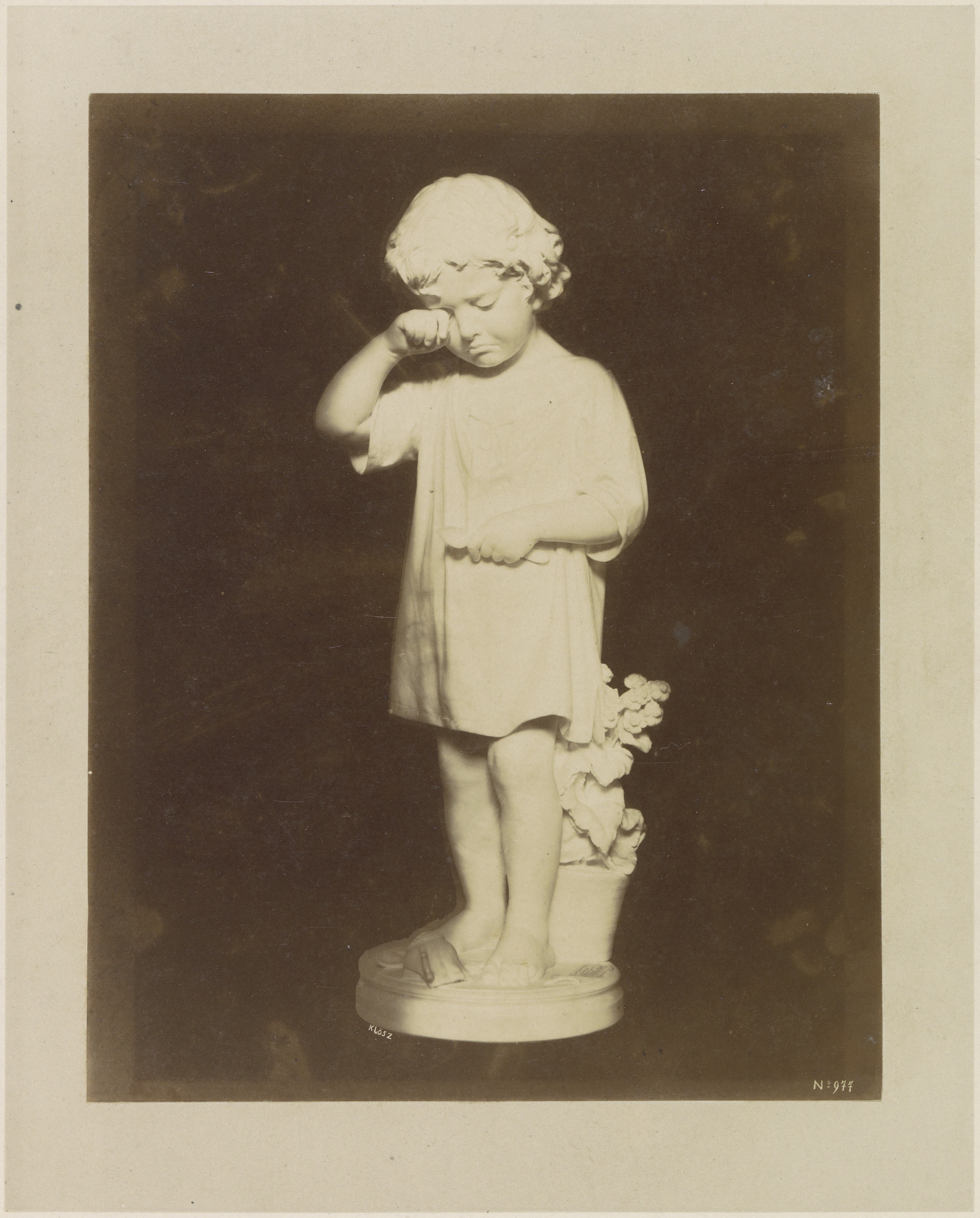 Sculptuur van een huilend kind voor een bak met bloemen