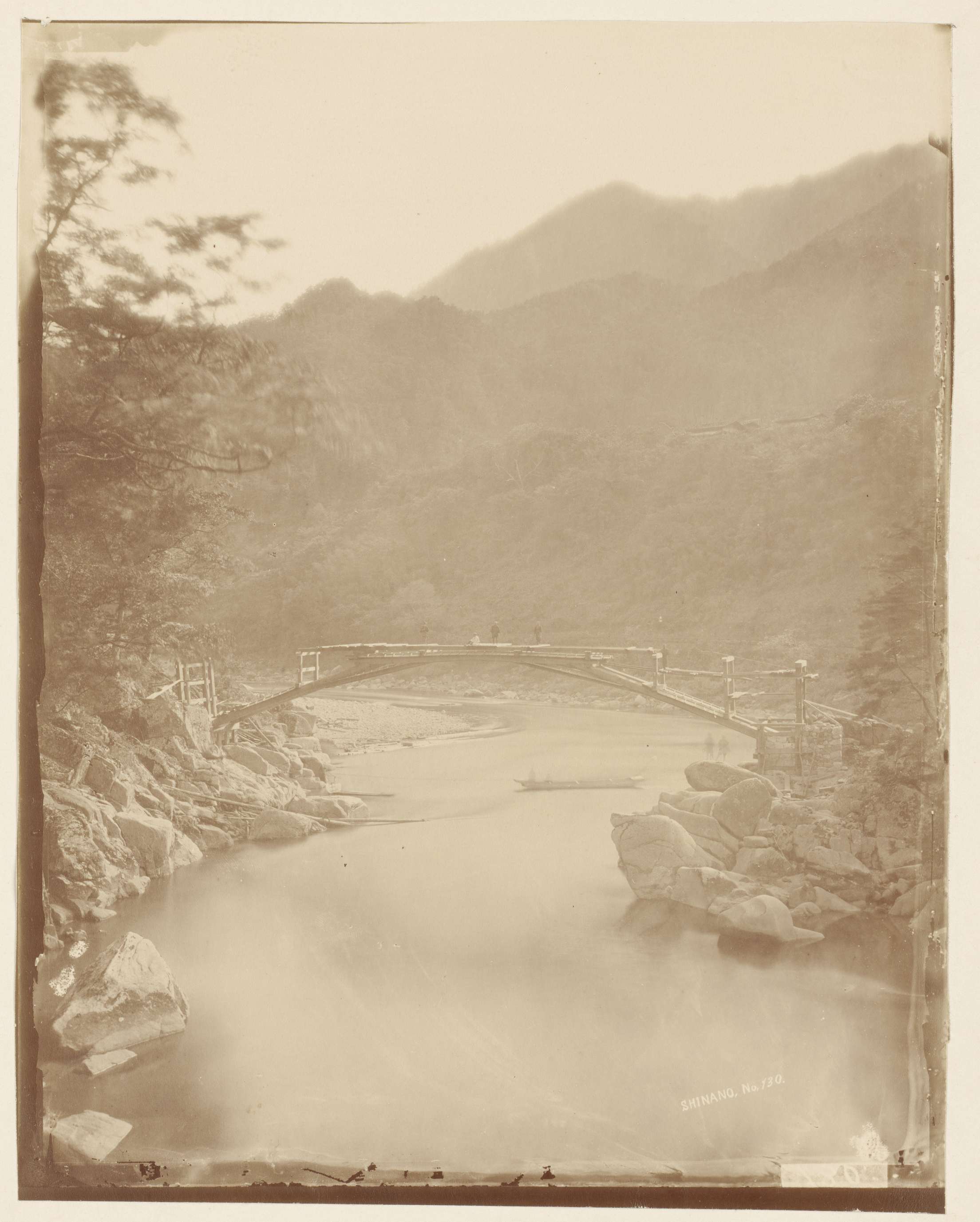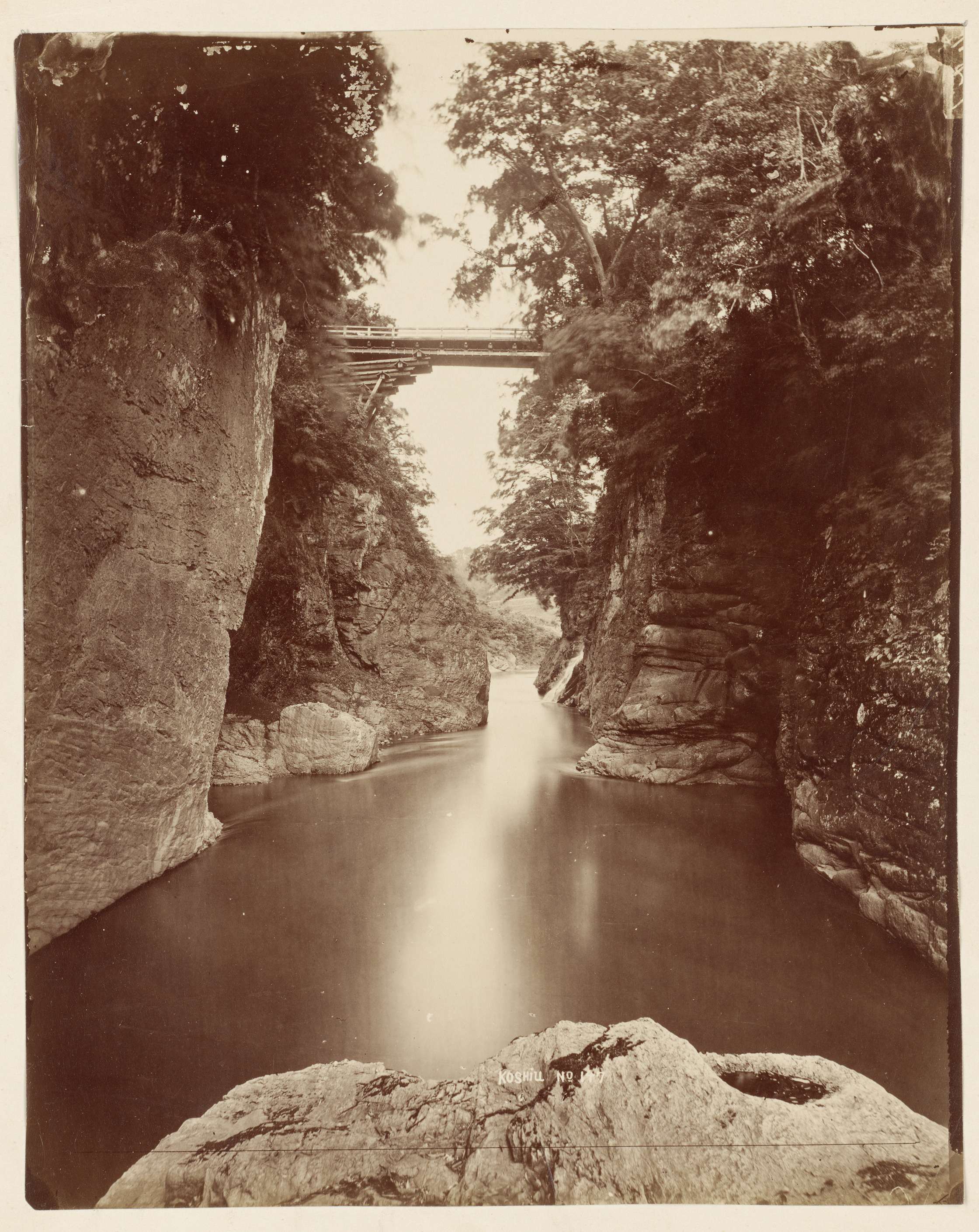 Gezicht op een brug over een rivier te Japan