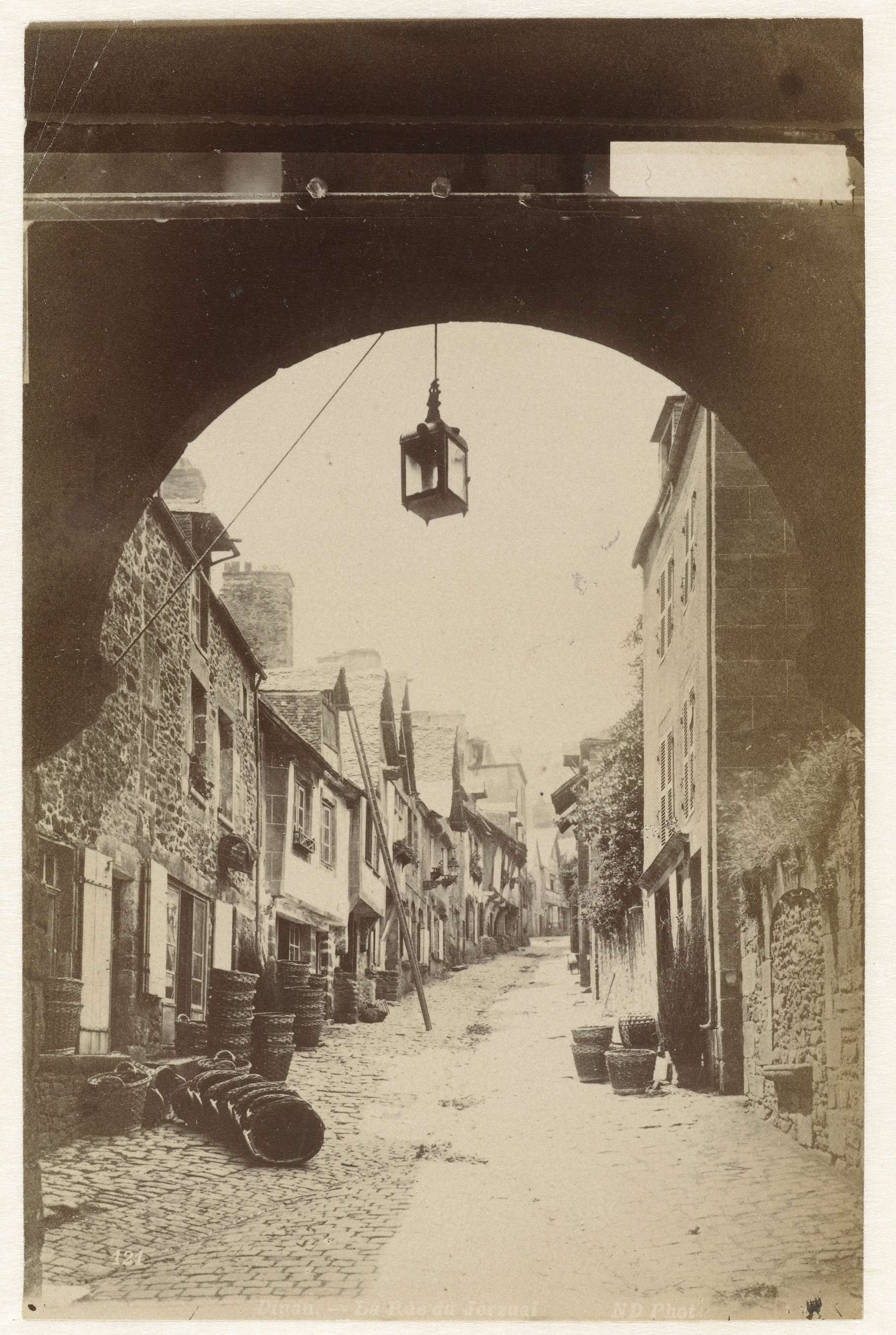 Straatgezicht in Dinan, gezien door een poort