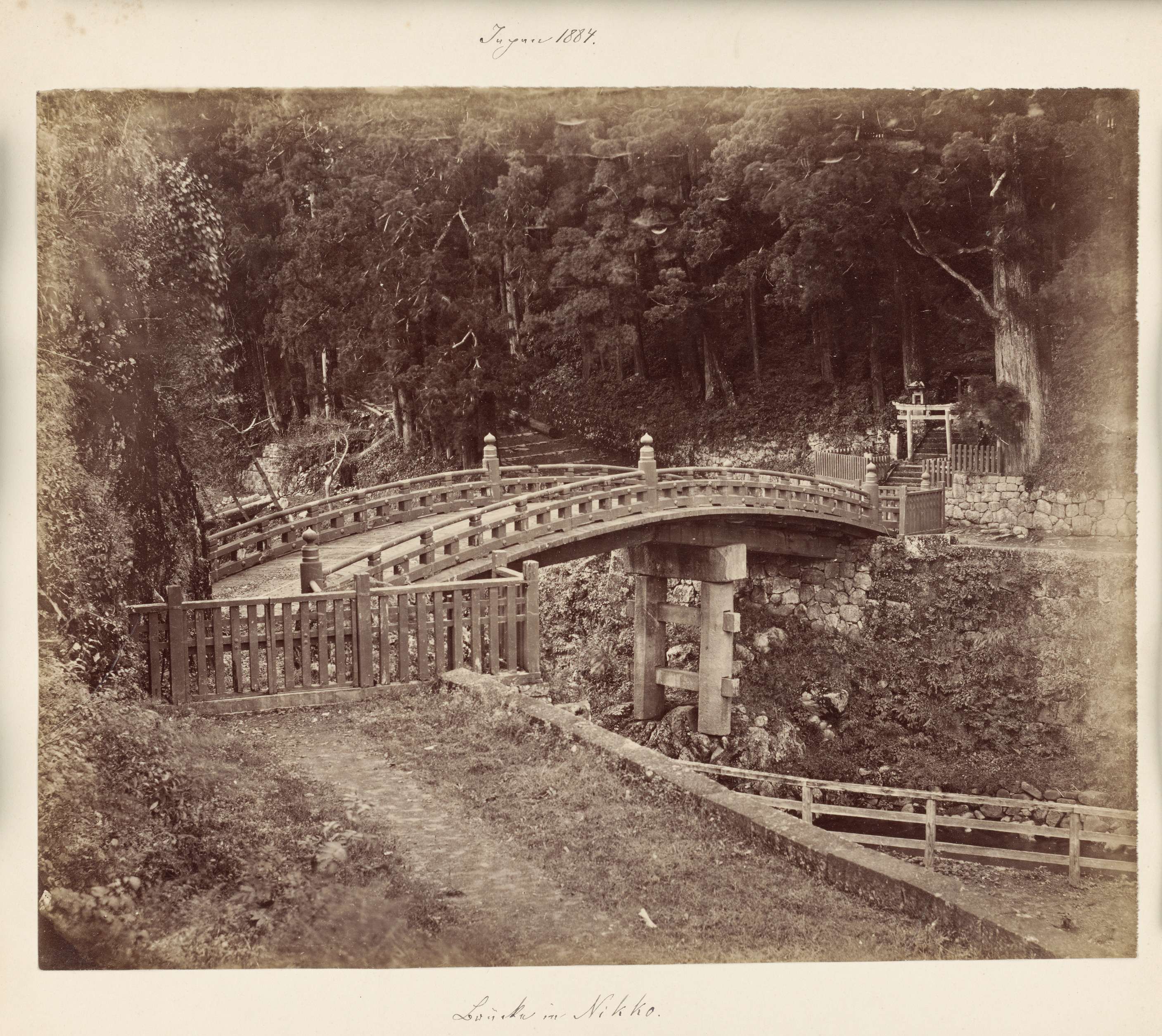 Brug over een rivier bij Nikko, rechts een torii
