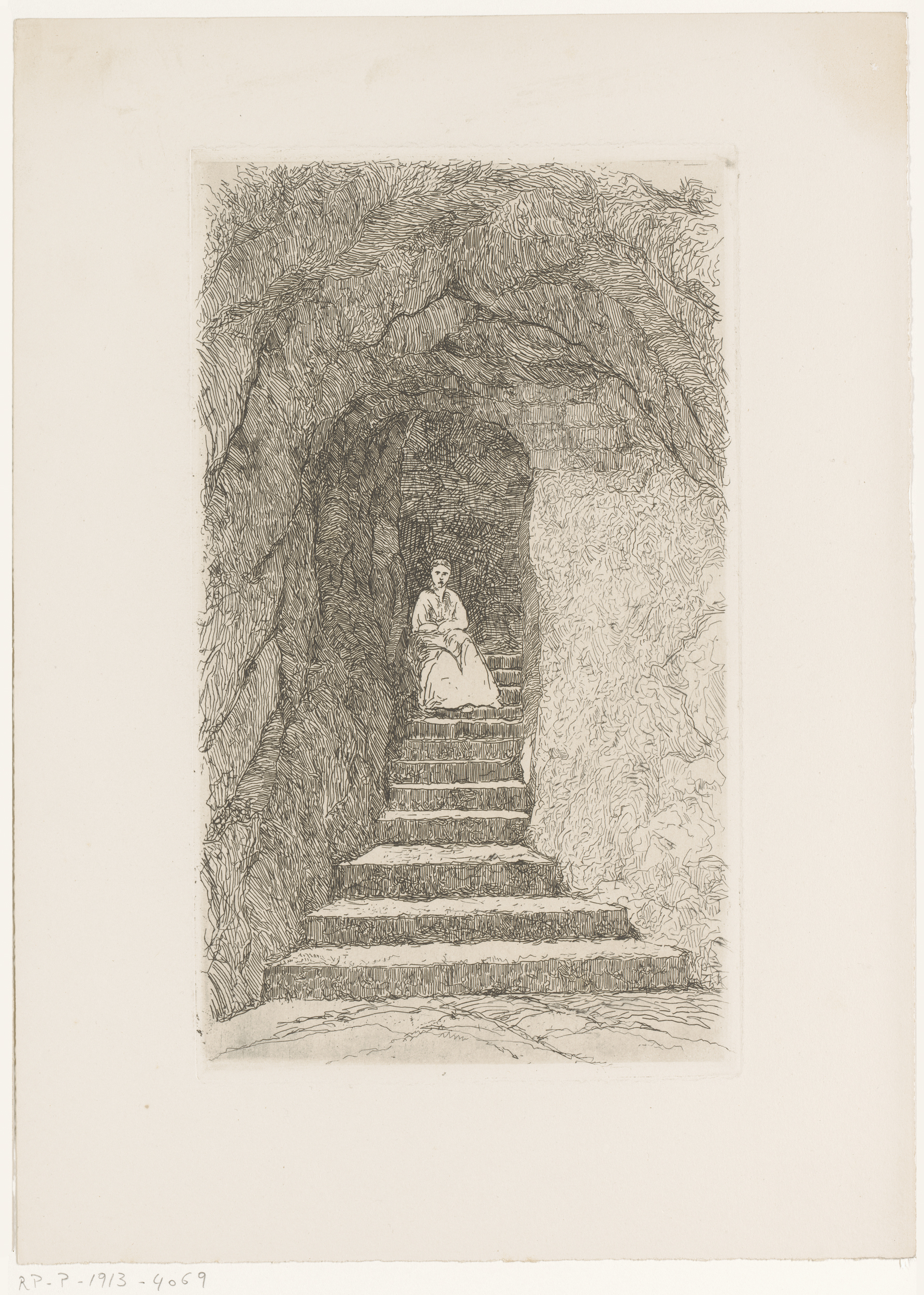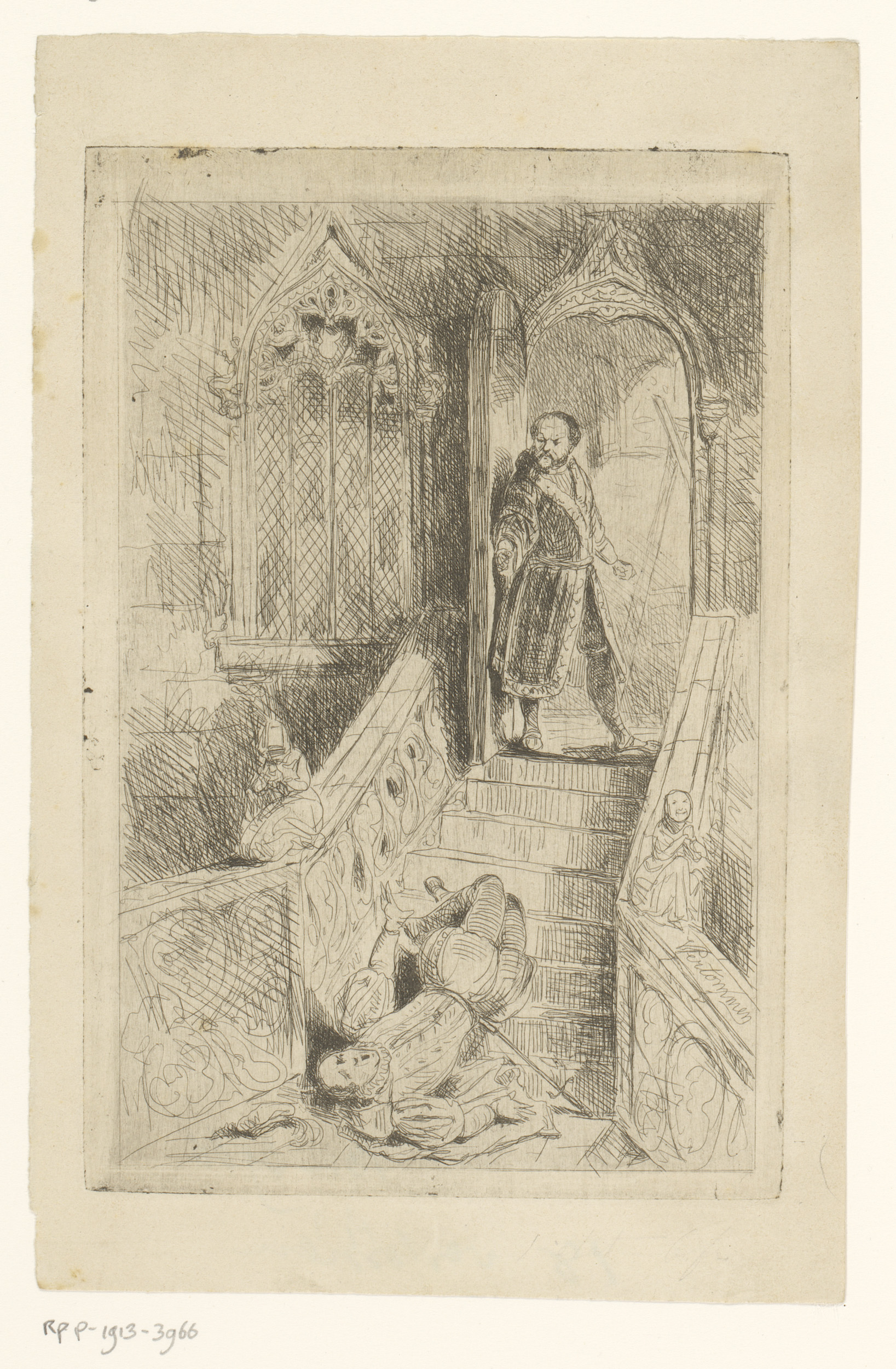 Hans Holbein bovenaan een trap met onderaan een geva...