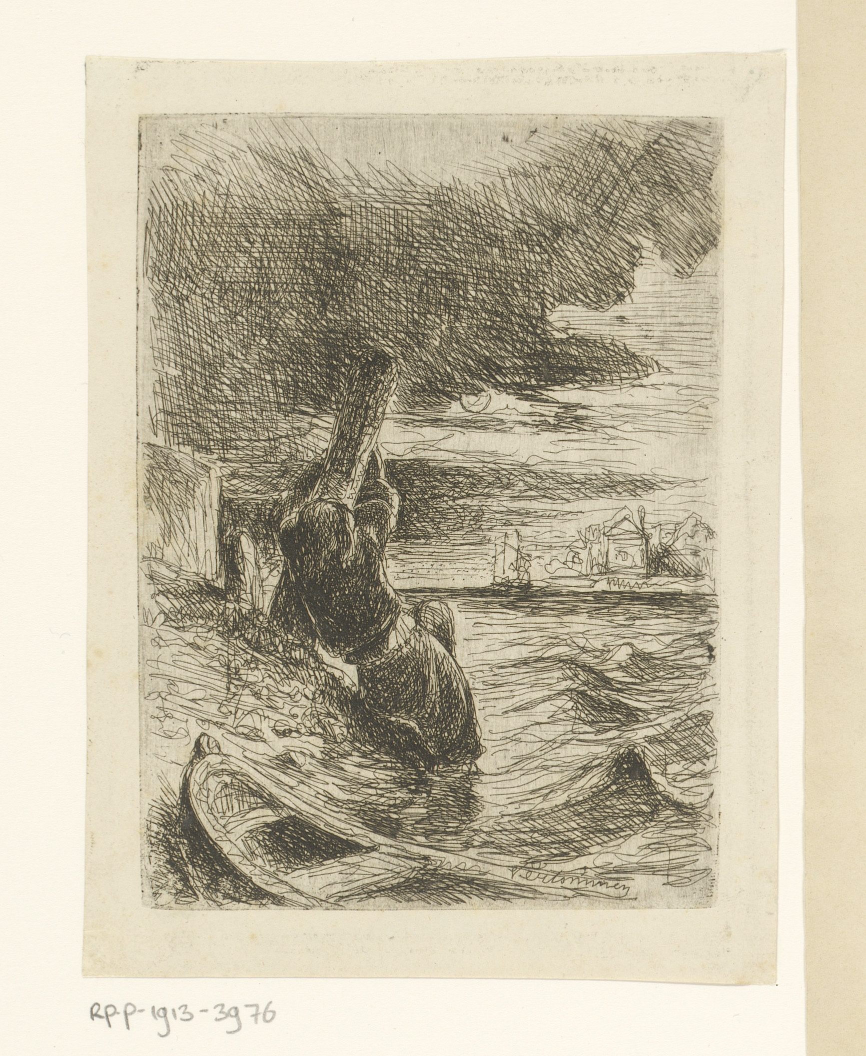 Schipbreukeling houdt zichzelf vast aan een paal lan...